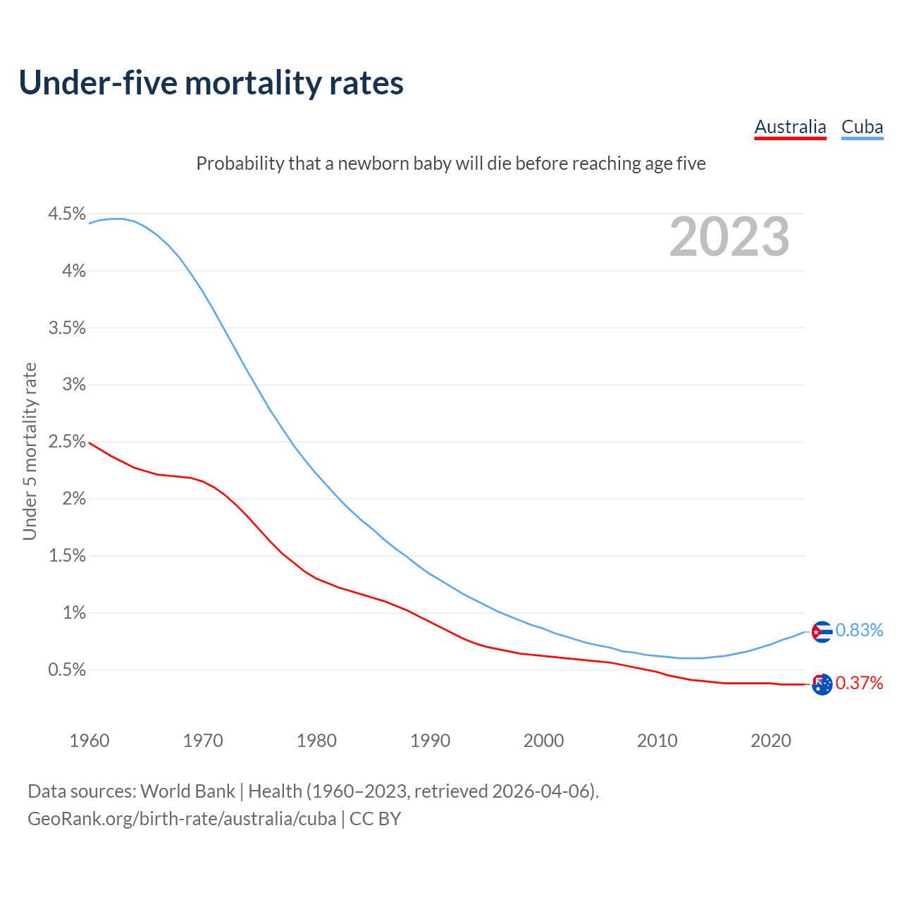 The chance that a newborn baby will die before reaching age five is 0.37% in Australia and 0.83% in Cuba. Above is a chart with historical data on under-five mortality rates.