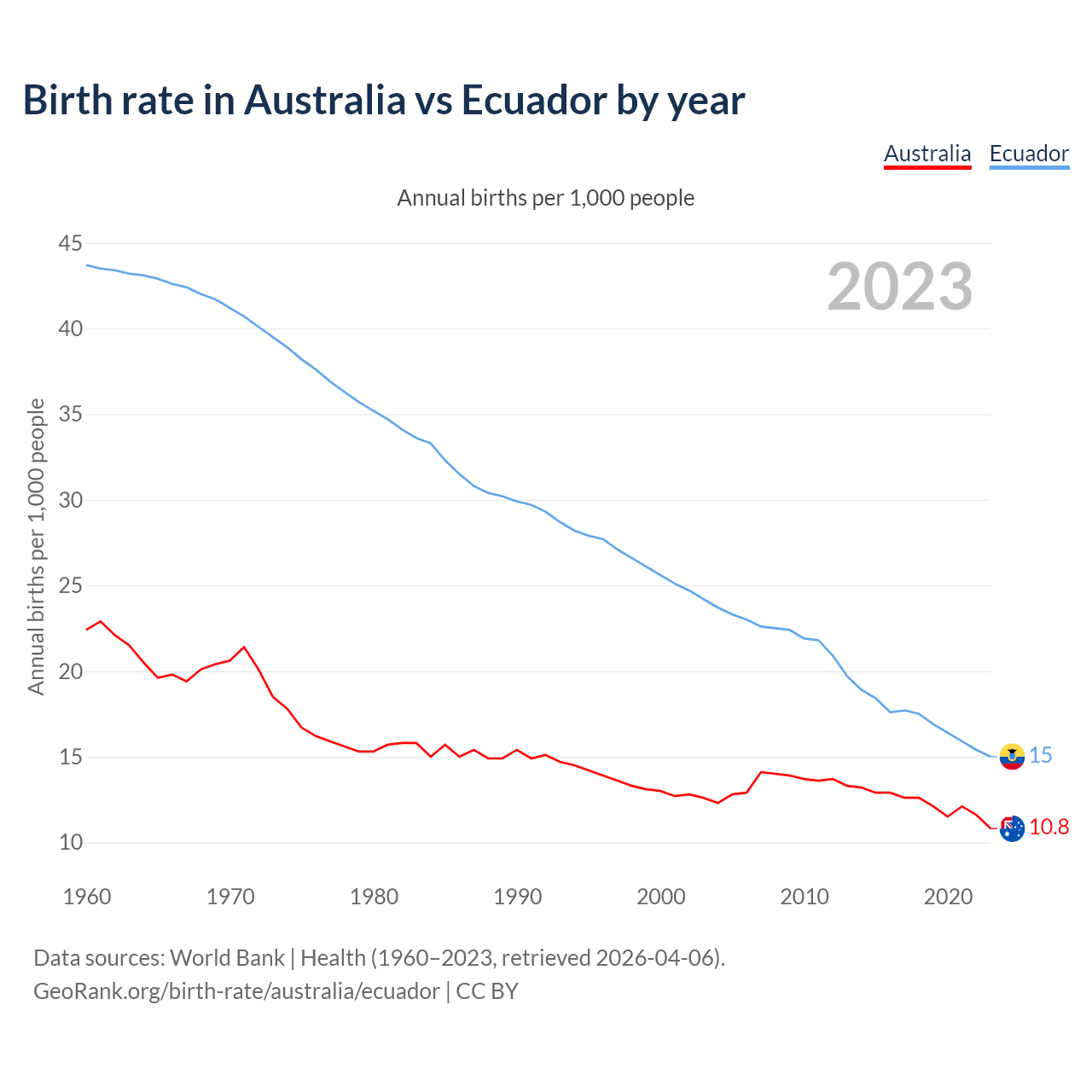 According to the latest available data on birth rates, the fertility rate in Australia was 1.5 children per woman in 2023, compared to 1.82 in Ecuador in 2023. The replacement level is considered to be 2.1 children per woman.