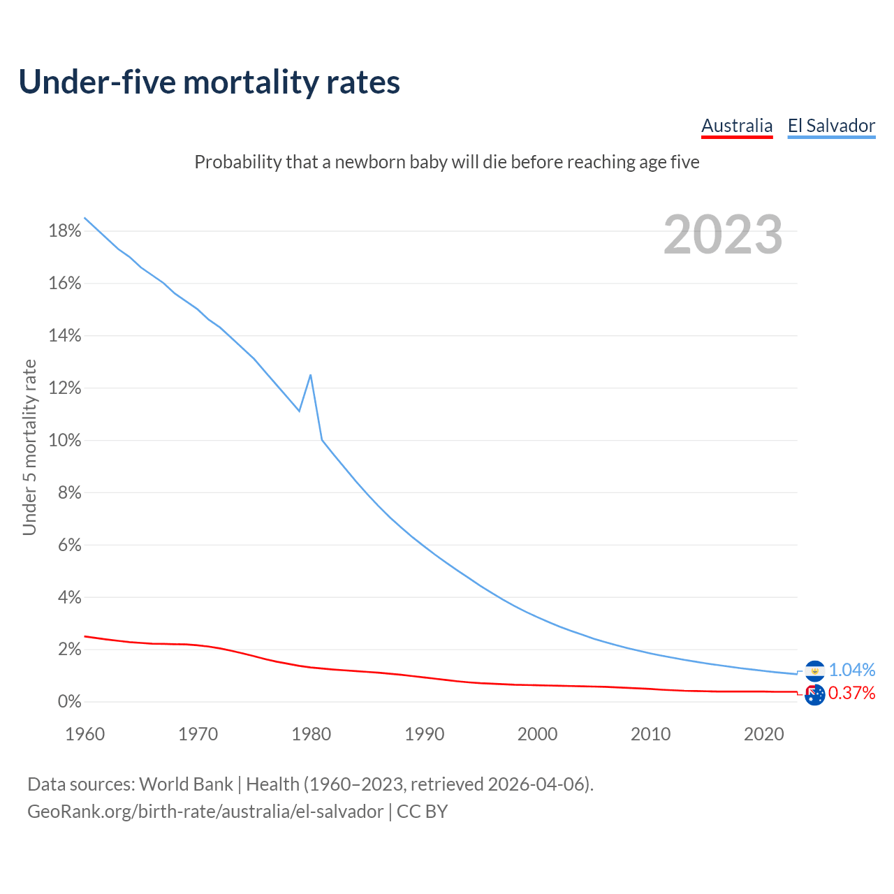 The chance that a newborn baby will die before reaching age five is 0.37% in Australia and 1.04% in El Salvador. Above is a chart with historical data on under-five mortality rates.