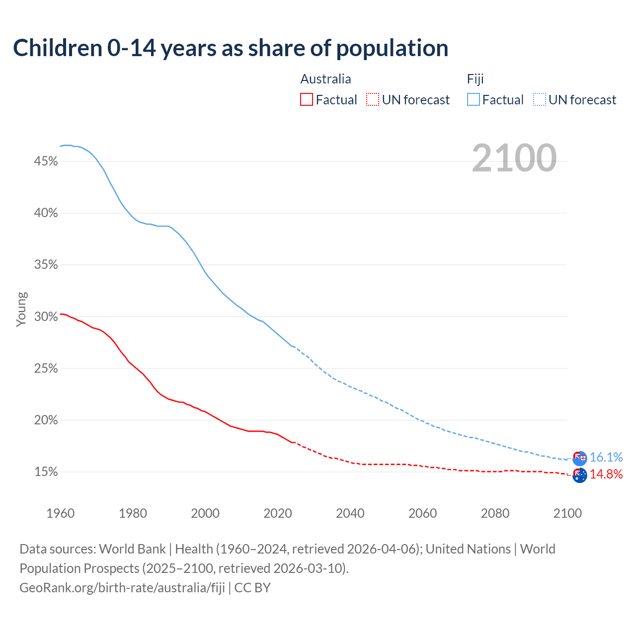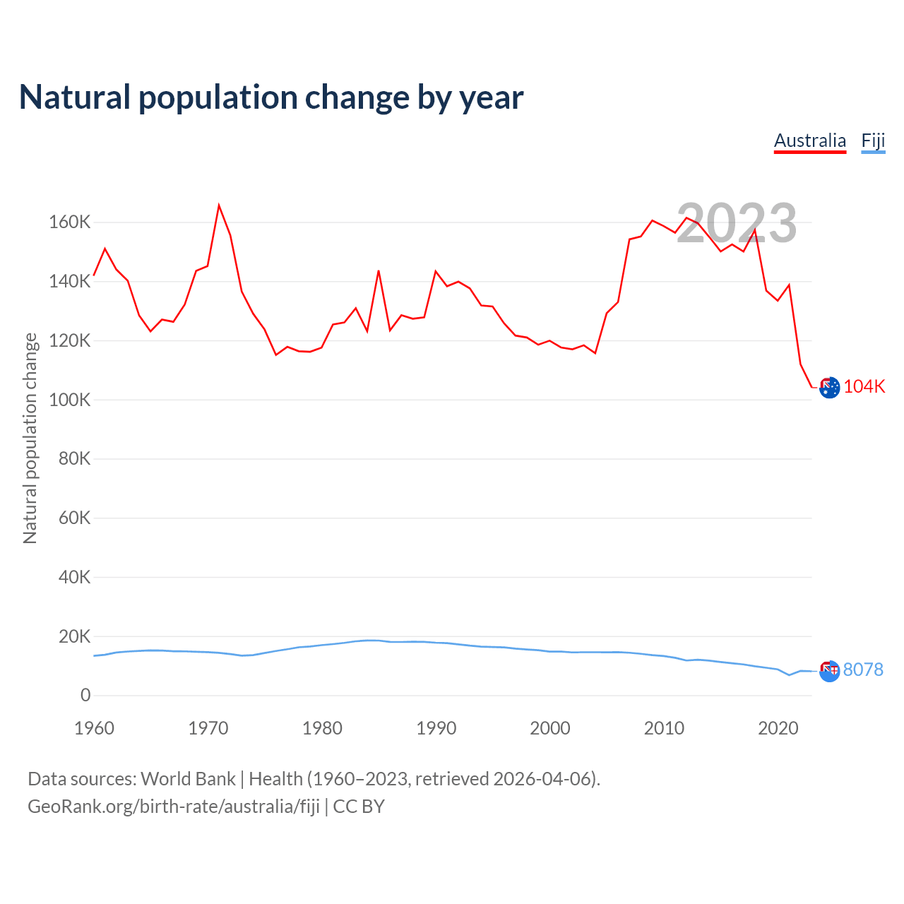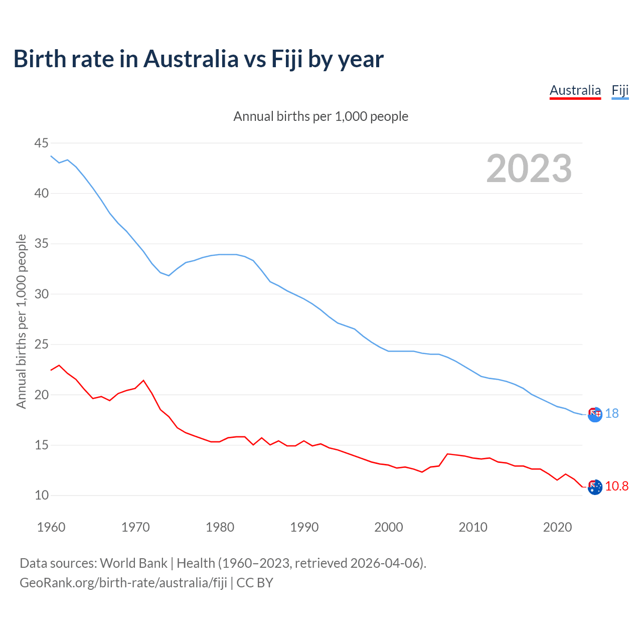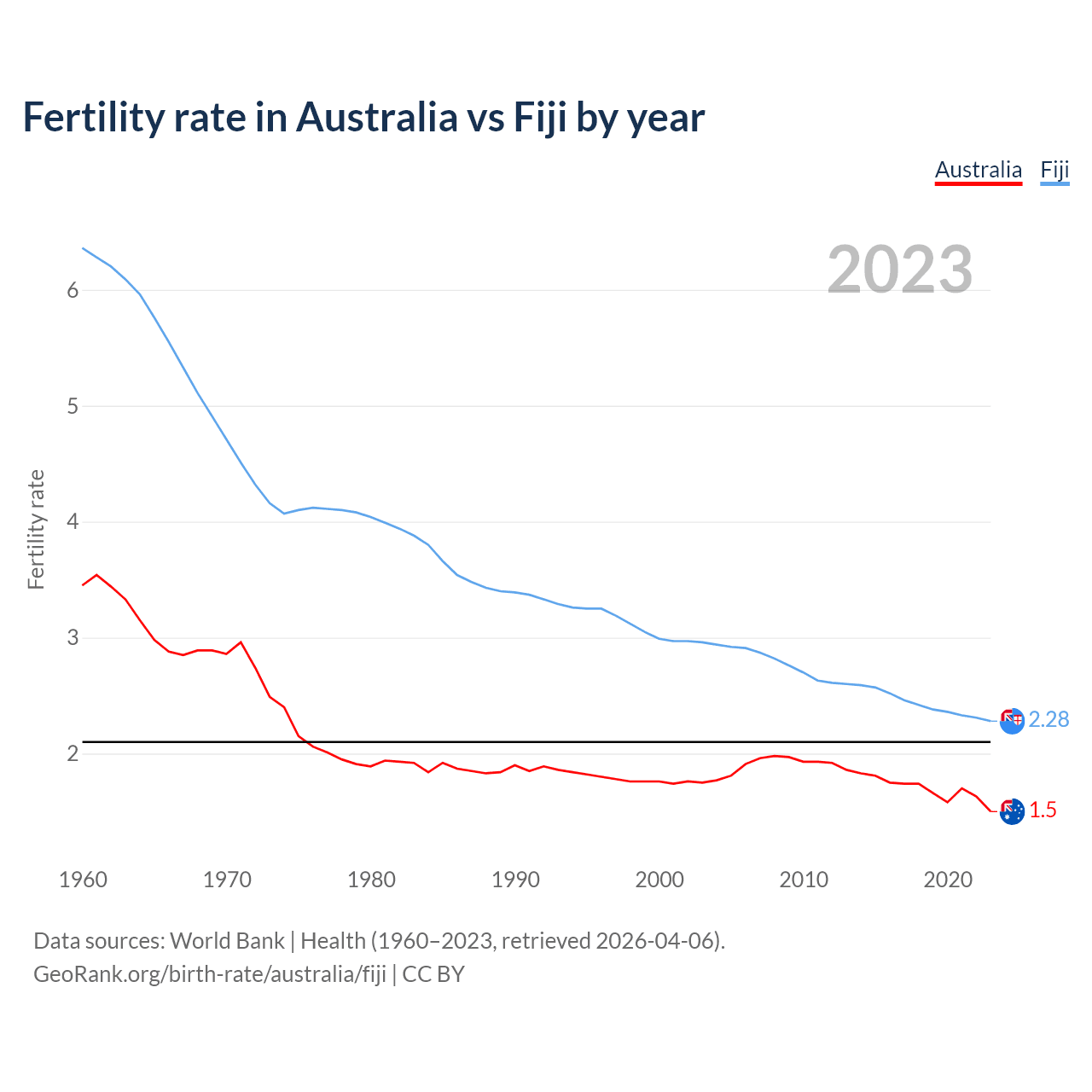 According to the latest available data on birth rates, the fertility rate in Australia was 1.5 children per woman in 2023, compared to 2.28 in Fiji in 2023. The replacement level is considered to be 2.1 children per woman.