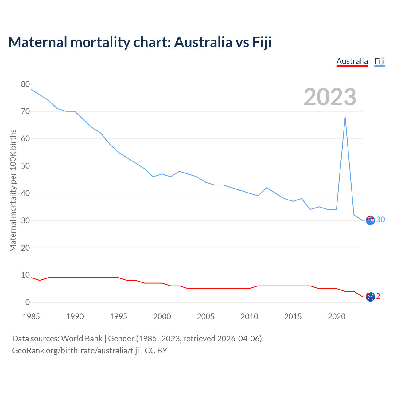 The maternal mortality rate, which is the probability of dying during childbirth or within 42 days of pregnancy termination, is 2 deaths per 100,000 live births in Australia, compared to 30 deaths in Fiji.