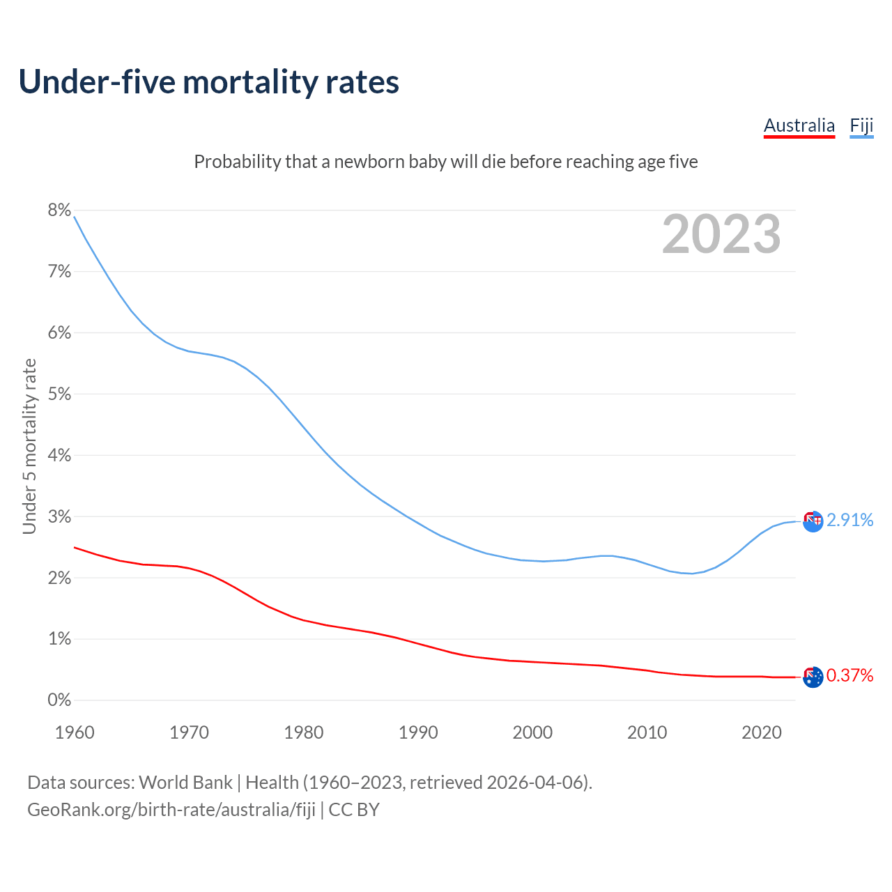 The chance that a newborn baby will die before reaching age five is 0.37% in Australia and 2.91% in Fiji. Above is a chart with historical data on under-five mortality rates.