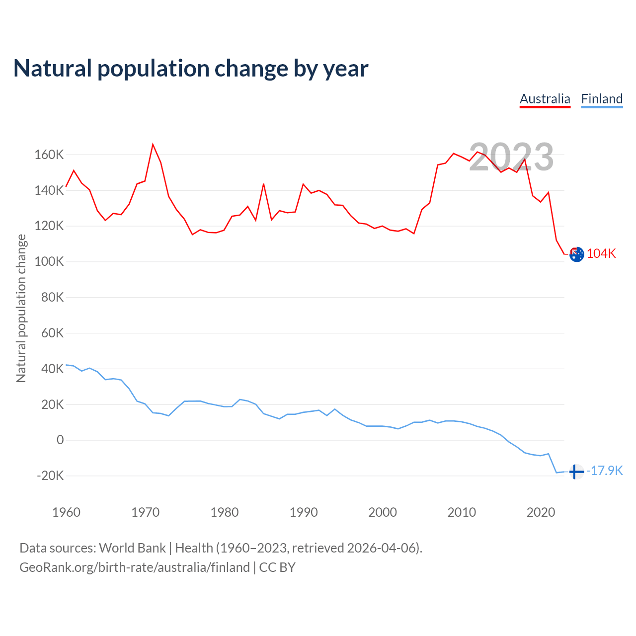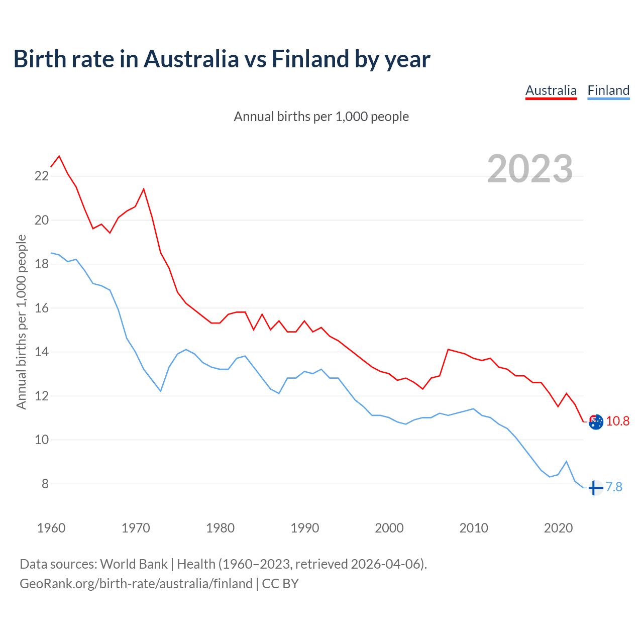 According to the latest available data on birth rates, the fertility rate in Australia was 1.5 children per woman in 2023, compared to 1.26 in Finland in 2023. The replacement level is considered to be 2.1 children per woman.