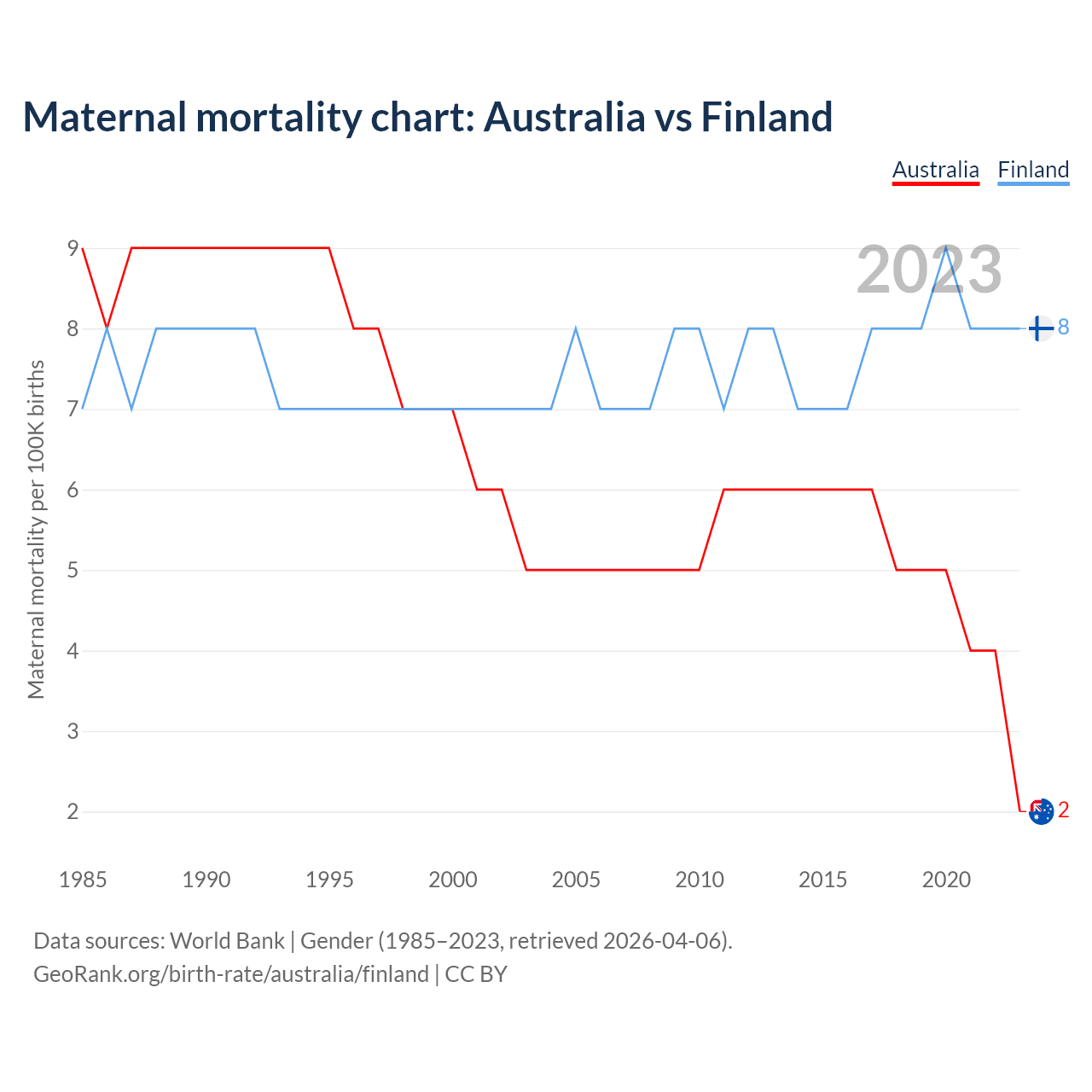 The maternal mortality rate, which is the probability of dying during childbirth or within 42 days of pregnancy termination, is 2 deaths per 100,000 live births in Australia, compared to 8 deaths in Finland.