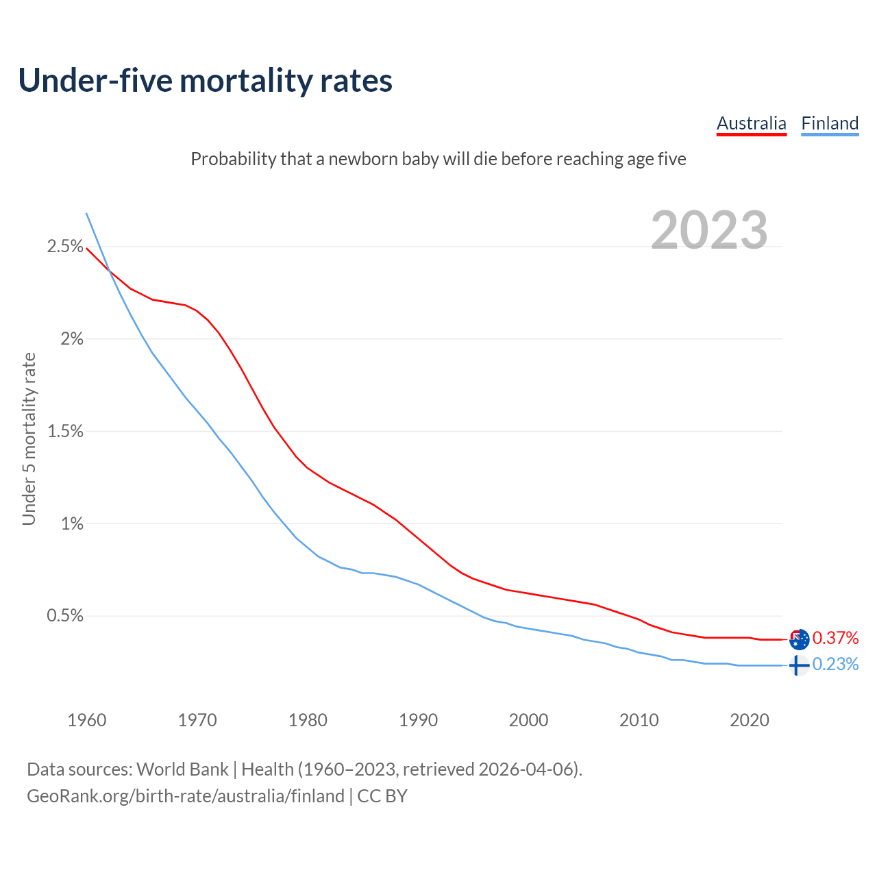 The chance that a newborn baby will die before reaching age five is 0.37% in Australia and 0.23% in Finland. Above is a chart with historical data on under-five mortality rates.