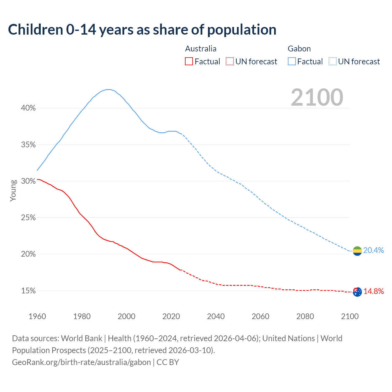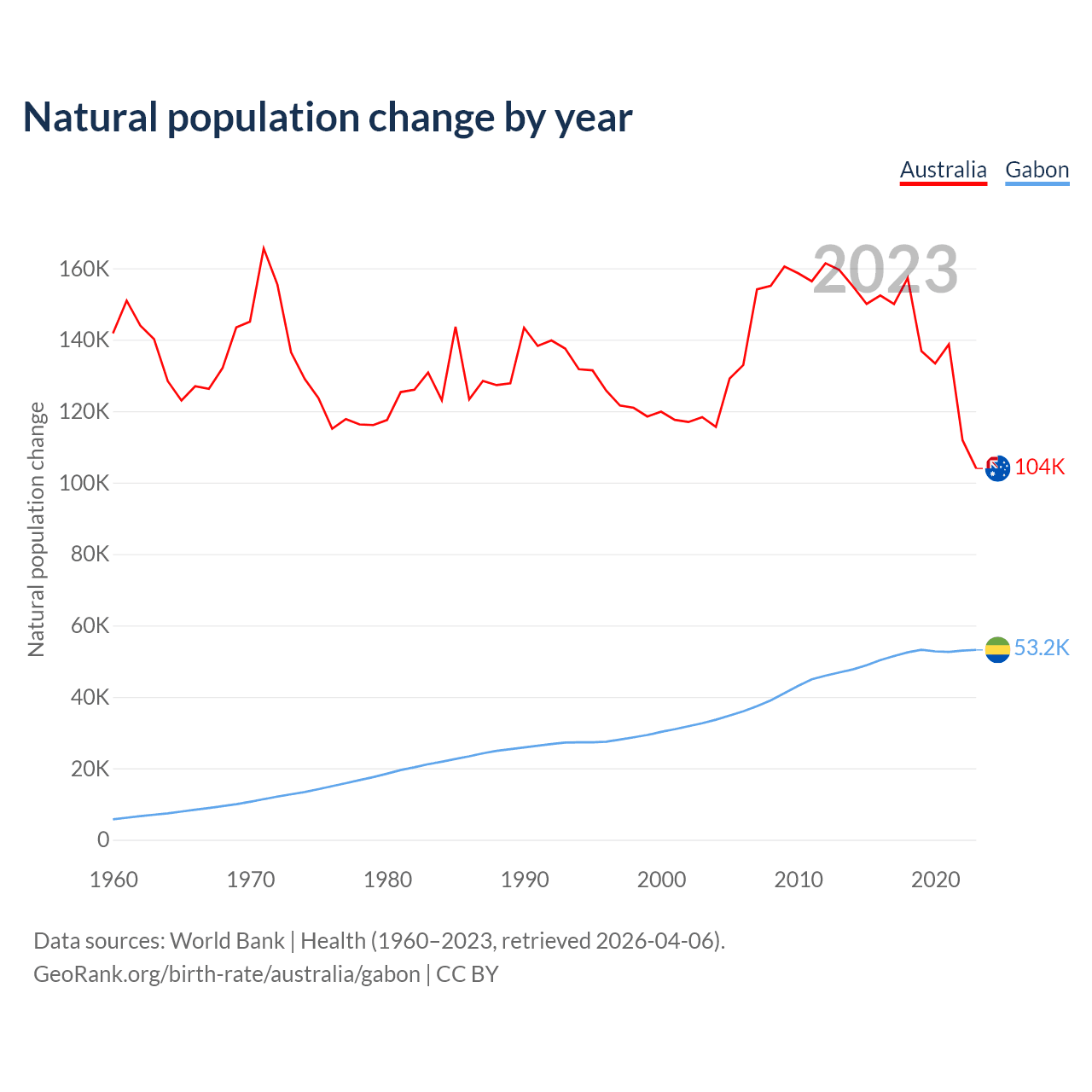 Australia has an annual birth rate of 10.8 births per 1,000 people, compared to 27.7 for Gabon. The average number of children a woman is expected to have during her lifetime — the fertility rate, is 1.5 in Australia and 3.65 in Gabon — 143.1% difference.