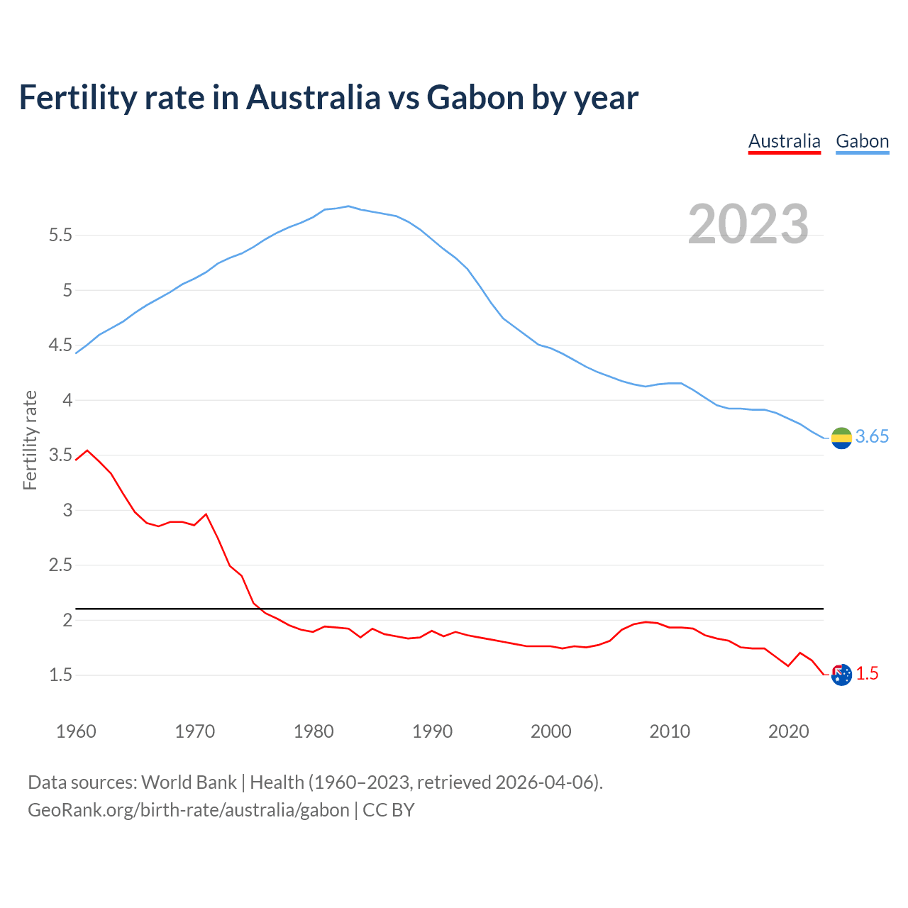 According to the latest available data on birth rates, the fertility rate in Australia was 1.5 children per woman in 2023, compared to 3.65 in Gabon in 2023. The replacement level is considered to be 2.1 children per woman.