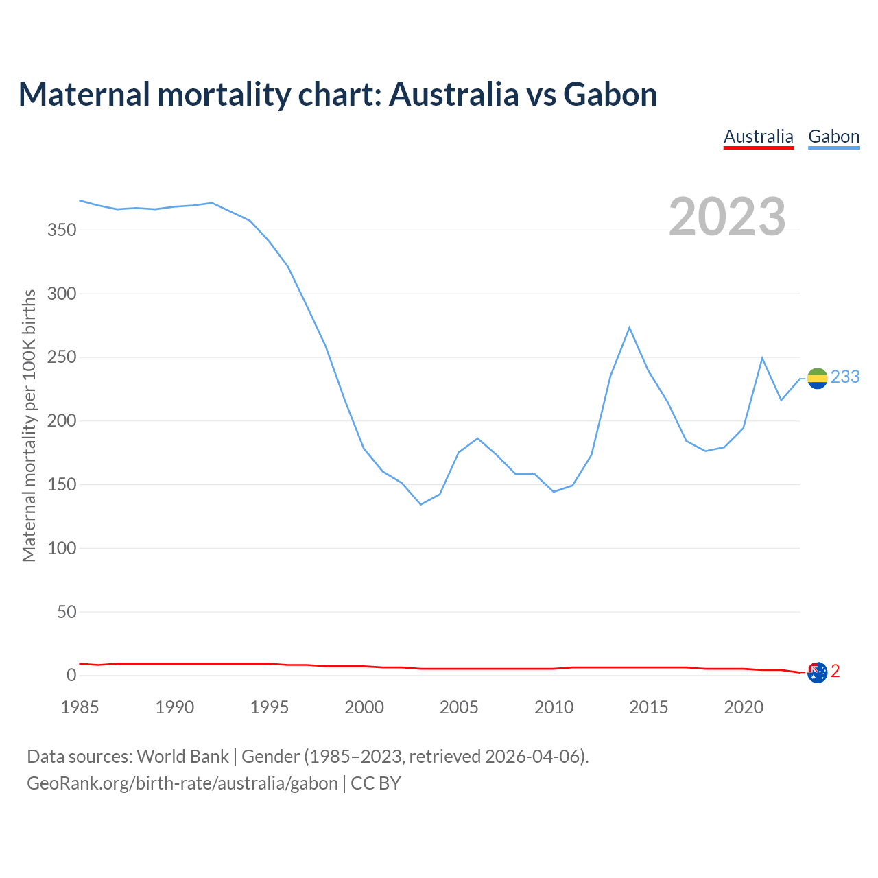 The maternal mortality rate, which is the probability of dying during childbirth or within 42 days of pregnancy termination, is 2 deaths per 100,000 live births in Australia, compared to 233 deaths in Gabon.