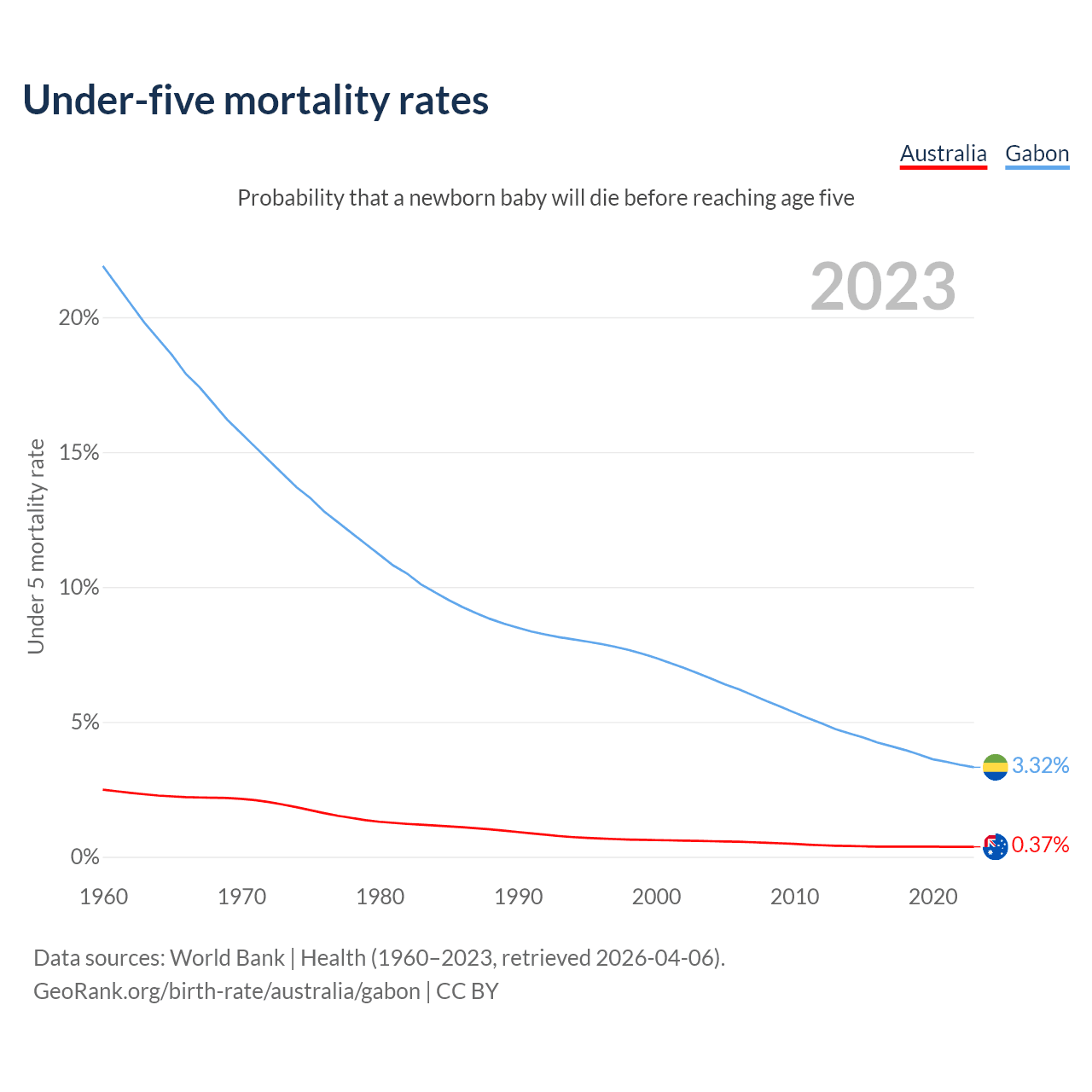 The chance that a newborn baby will die before reaching age five is 0.37% in Australia and 3.32% in Gabon. Above is a chart with historical data on under-five mortality rates.