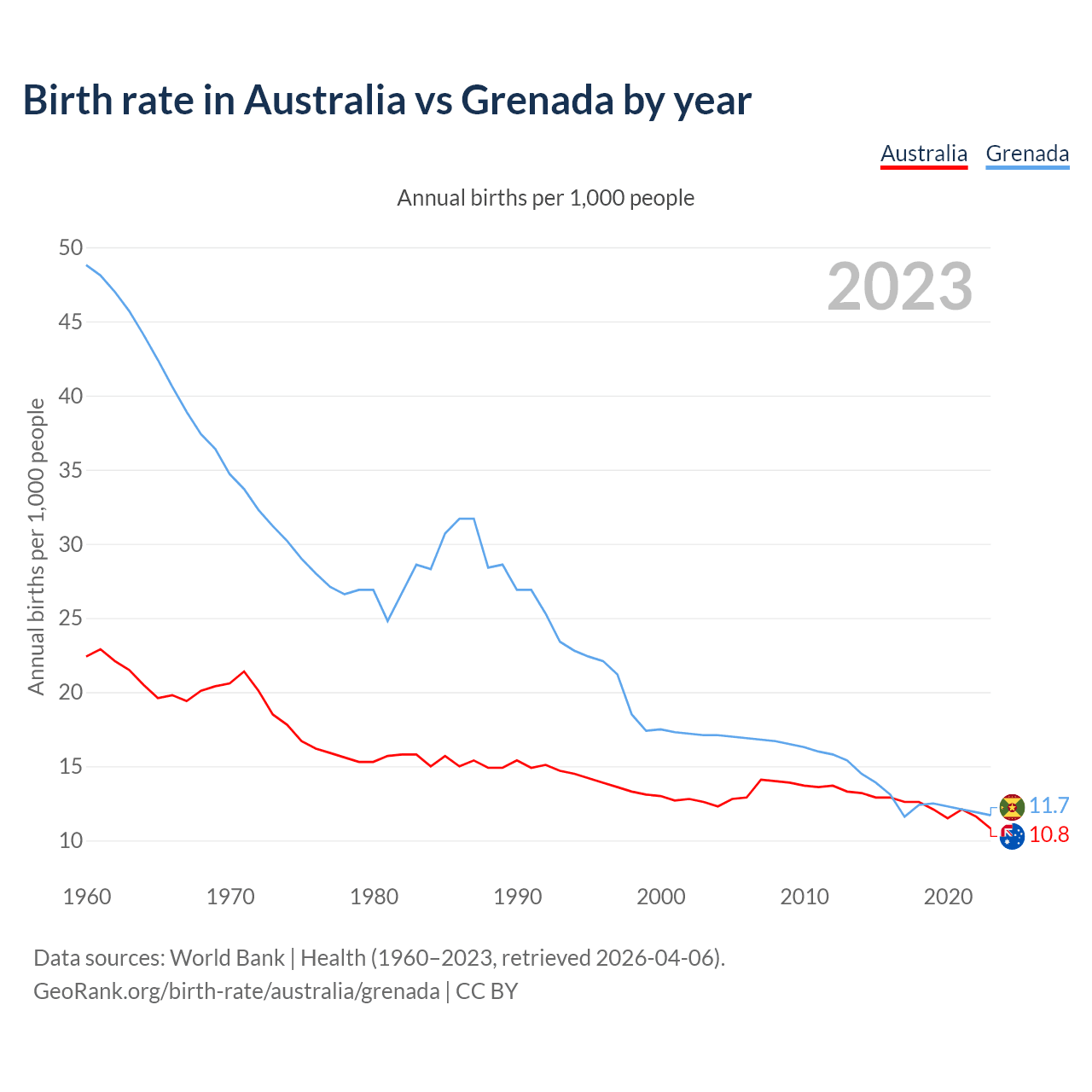 According to the latest available data on birth rates, the fertility rate in Australia was 1.5 children per woman in 2023, compared to 1.49 in Grenada in 2023. The replacement level is considered to be 2.1 children per woman.