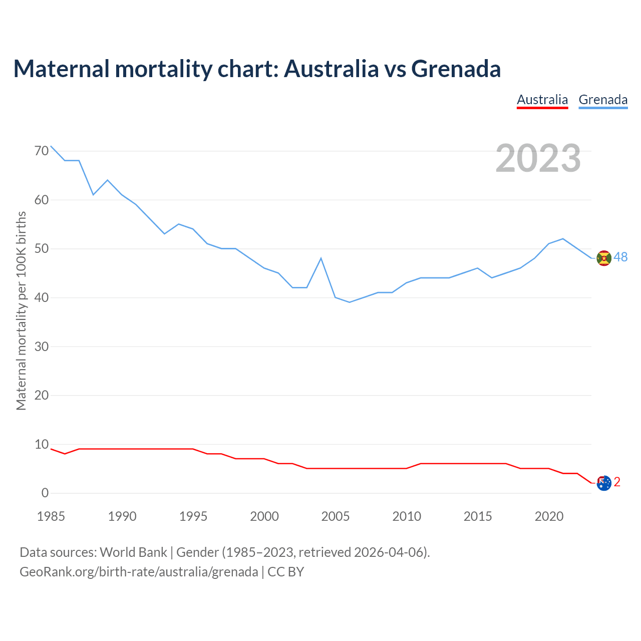 The maternal mortality rate, which is the probability of dying during childbirth or within 42 days of pregnancy termination, is 2 deaths per 100,000 live births in Australia, compared to 48 deaths in Grenada.