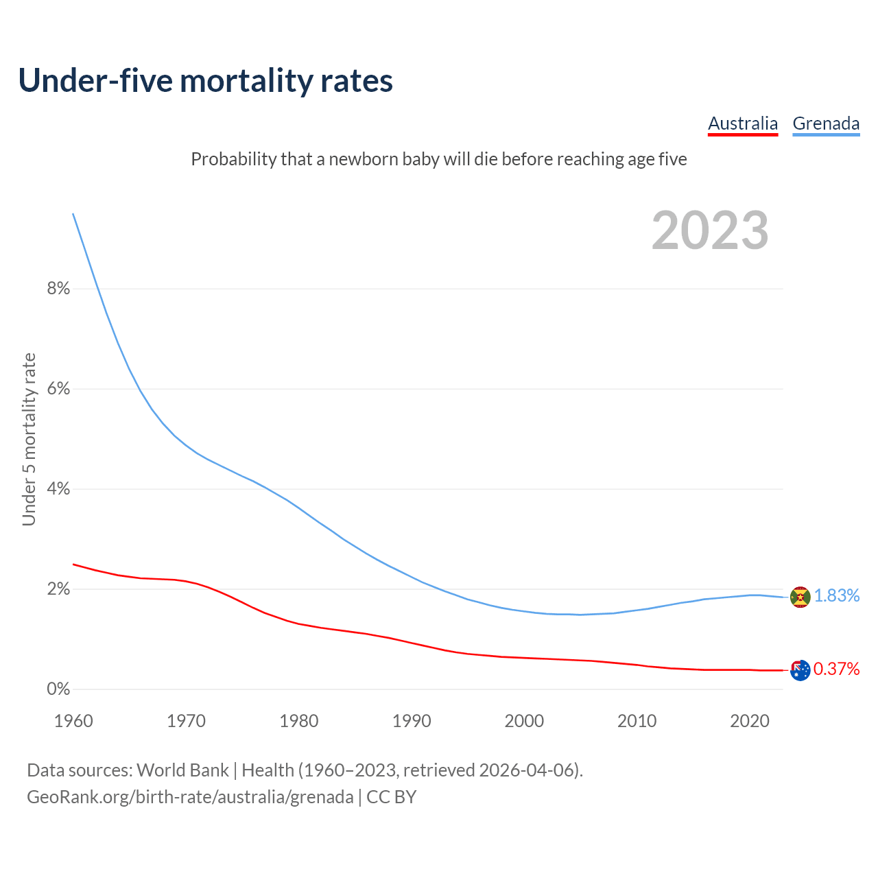 The chance that a newborn baby will die before reaching age five is 0.37% in Australia and 1.83% in Grenada. Above is a chart with historical data on under-five mortality rates.
