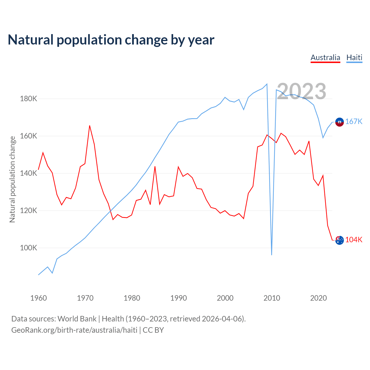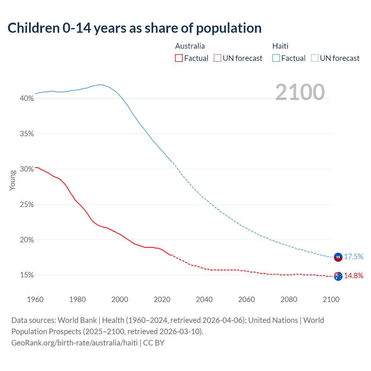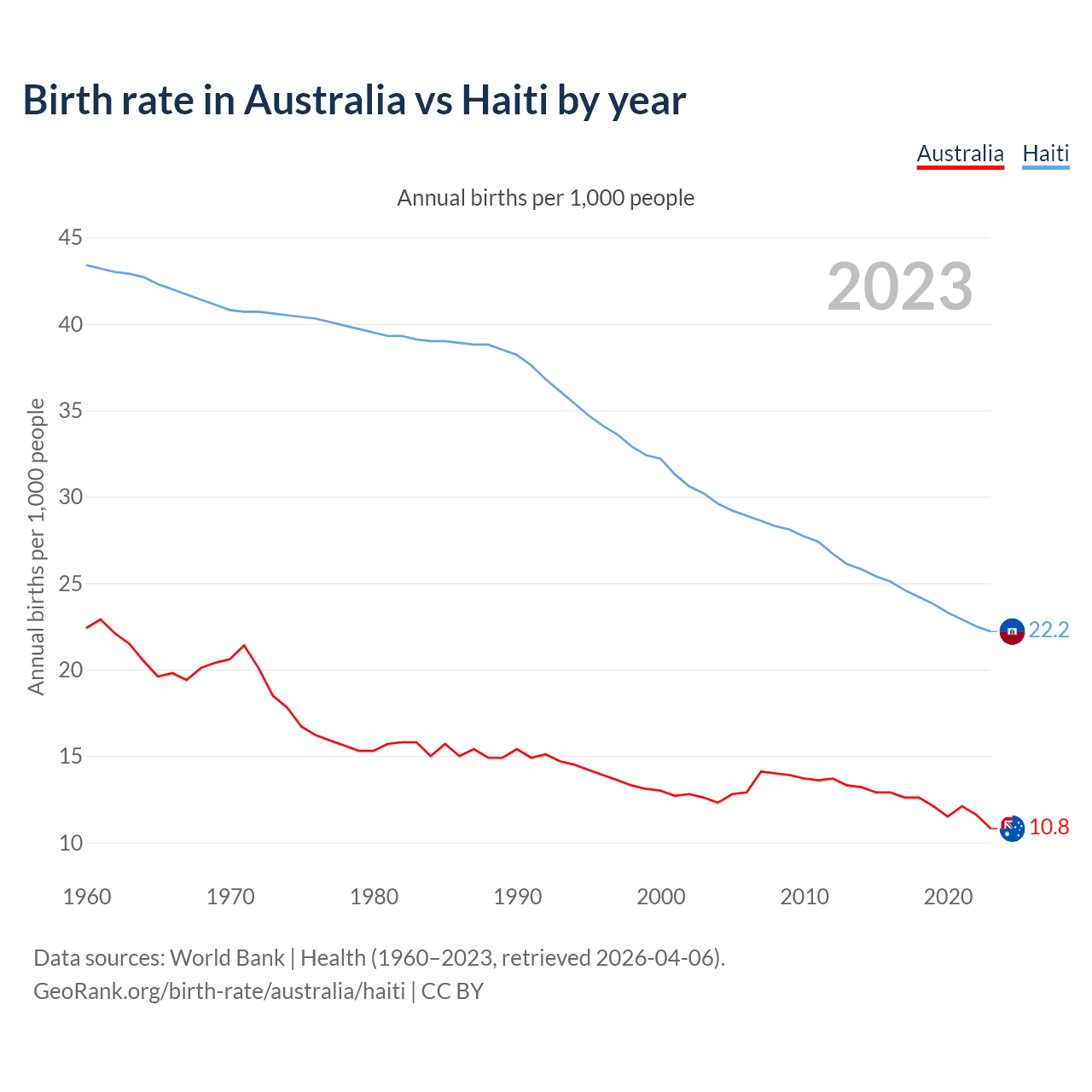 According to the latest available data on birth rates, the fertility rate in Australia was 1.5 children per woman in 2023, compared to 2.66 in Haiti in 2023. The replacement level is considered to be 2.1 children per woman.