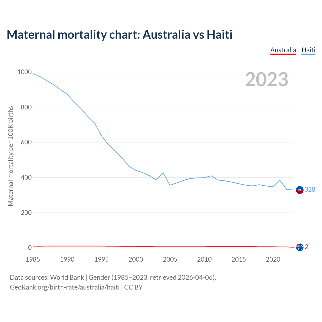 The maternal mortality rate, which is the probability of dying during childbirth or within 42 days of pregnancy termination, is 2 deaths per 100,000 live births in Australia, compared to 328 deaths in Haiti.