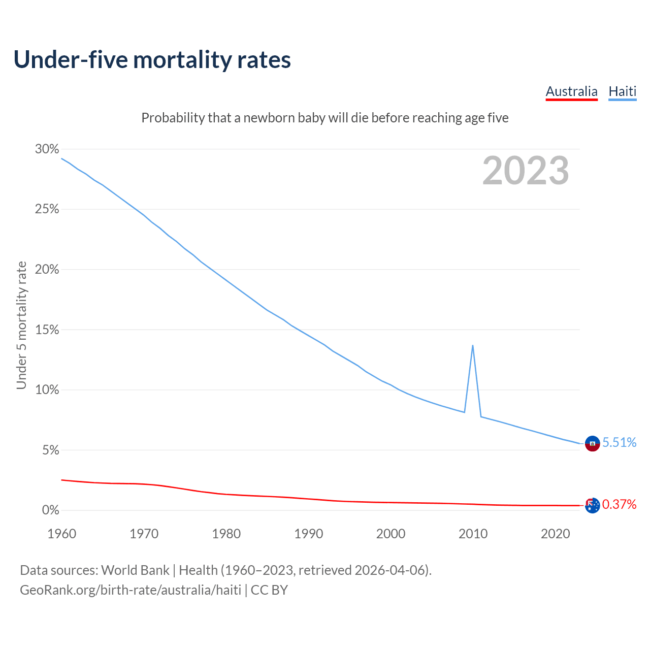 The chance that a newborn baby will die before reaching age five is 0.37% in Australia and 5.51% in Haiti. Above is a chart with historical data on under-five mortality rates.