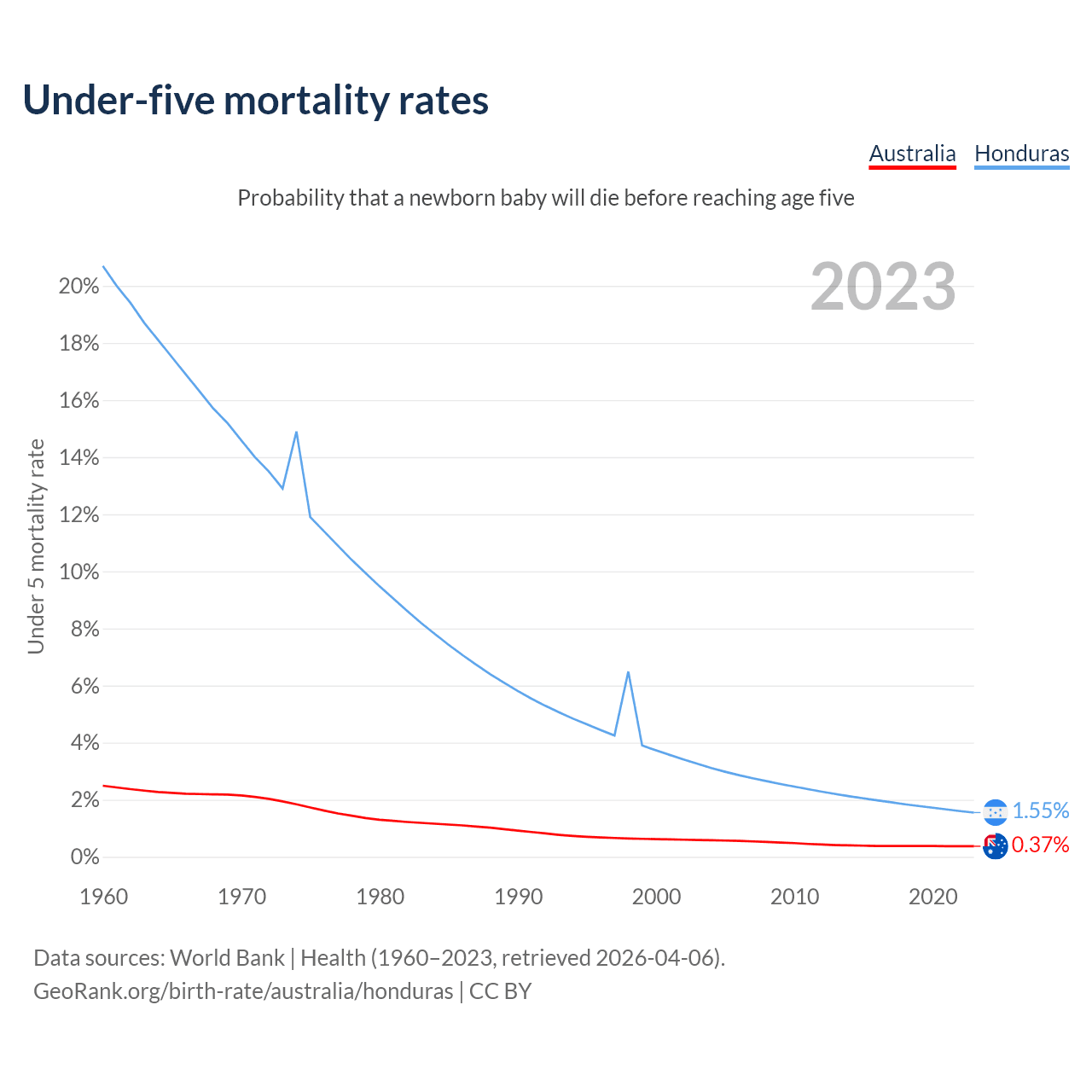 The chance that a newborn baby will die before reaching age five is 0.37% in Australia and 1.55% in Honduras. Above is a chart with historical data on under-five mortality rates.