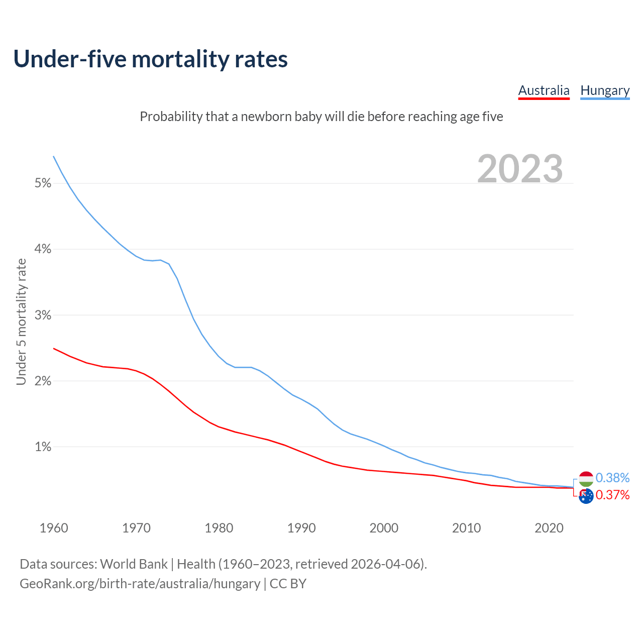 The chance that a newborn baby will die before reaching age five is 0.37% in Australia and 0.38% in Hungary. Above is a chart with historical data on under-five mortality rates.