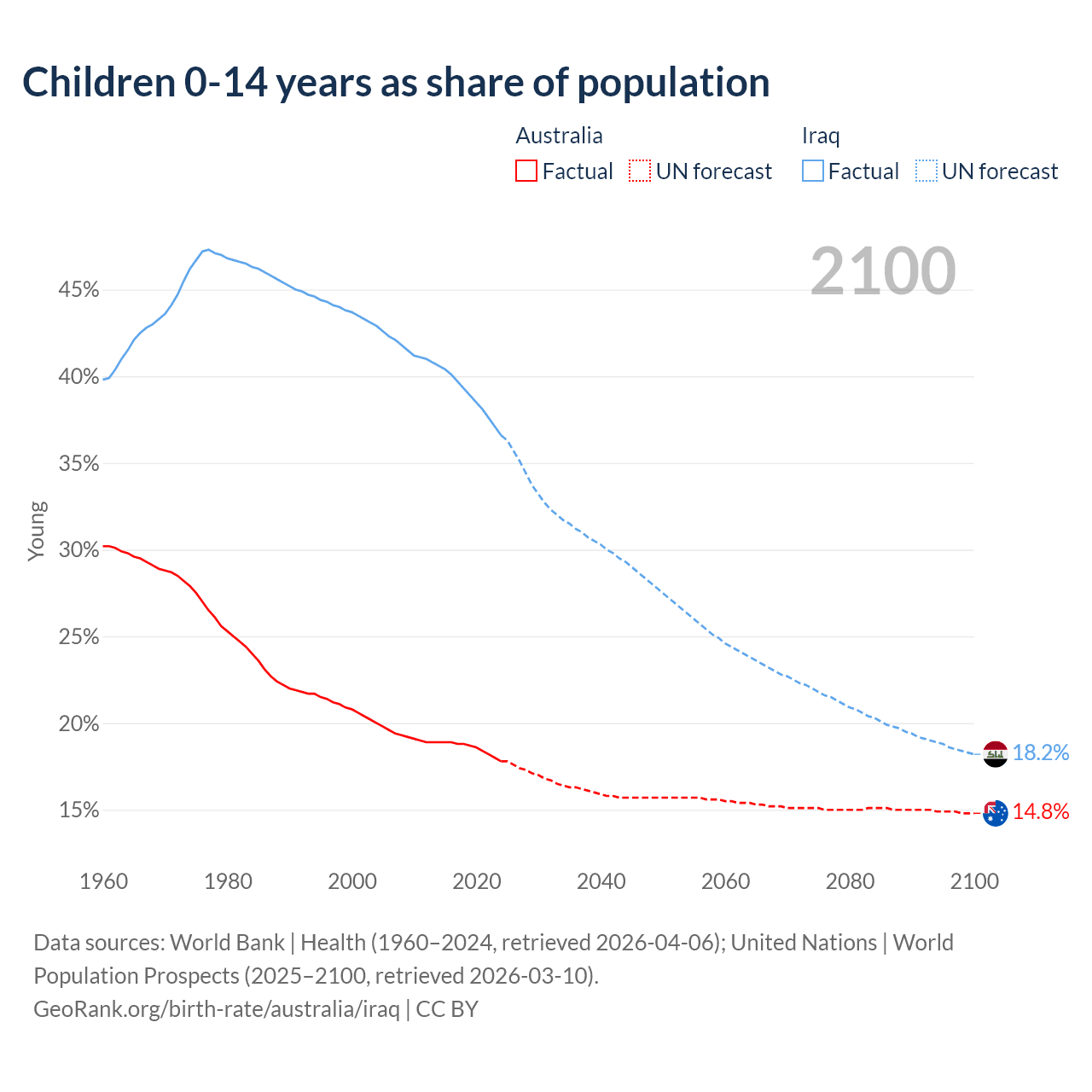 According to the latest available data on birth rates, the fertility rate in Australia was 1.5 children per woman in 2023, compared to 3.25 in Iraq in 2023. The replacement level is considered to be 2.1 children per woman.