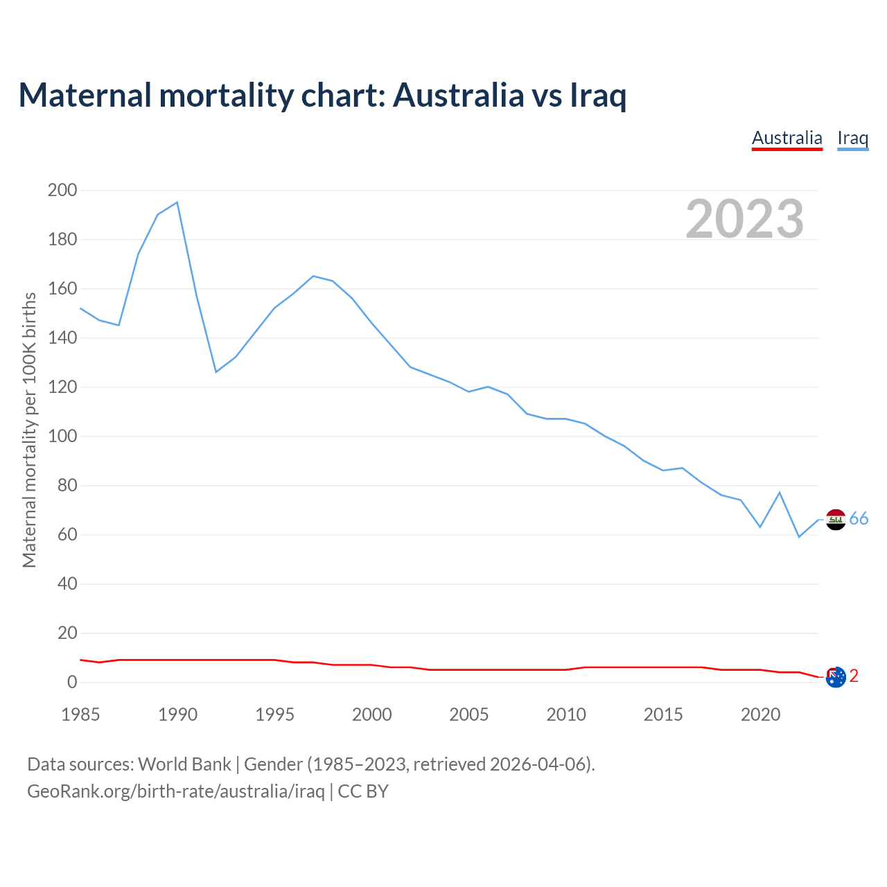 The maternal mortality rate, which is the probability of dying during childbirth or within 42 days of pregnancy termination, is 2 deaths per 100,000 live births in Australia, compared to 66 deaths in Iraq.