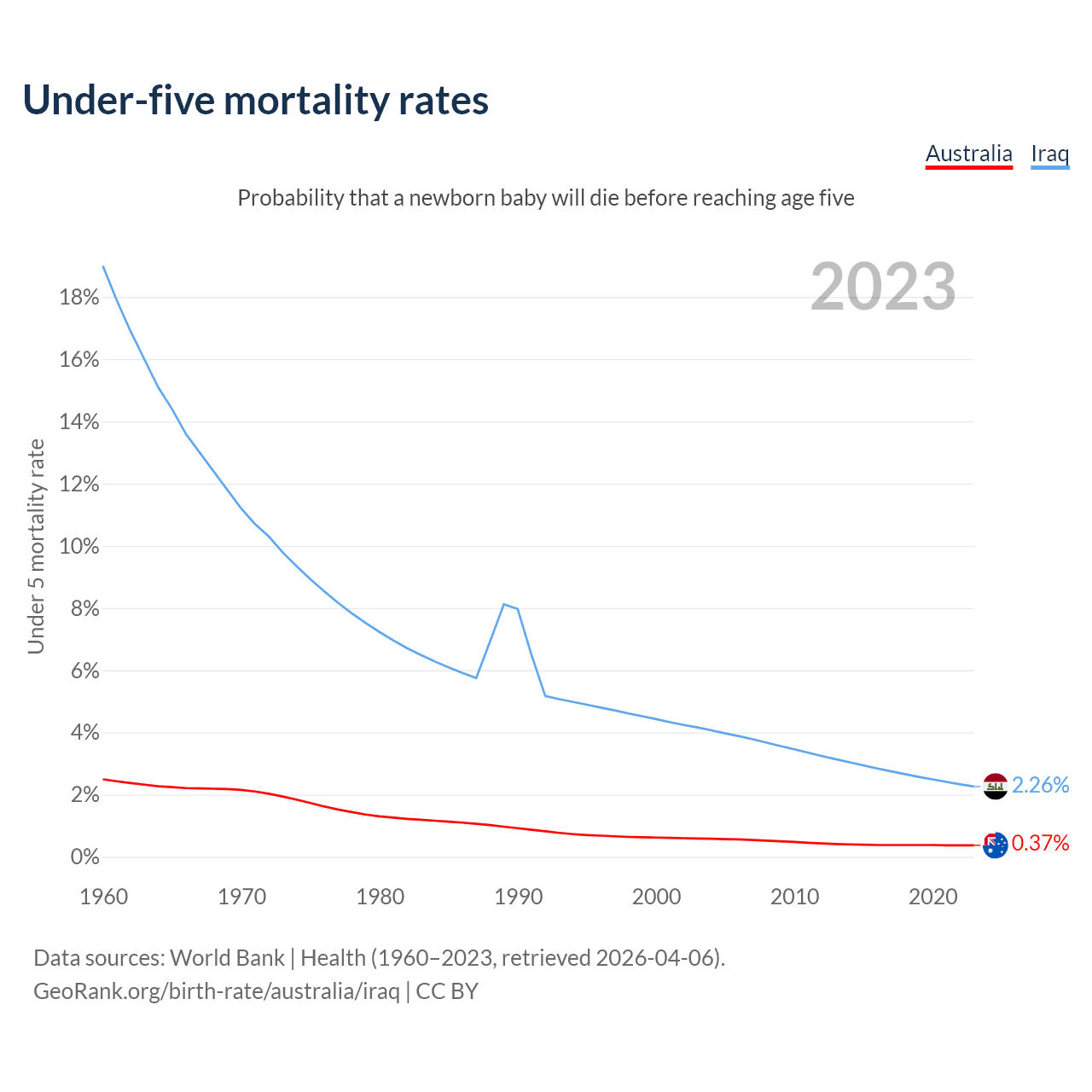 The chance that a newborn baby will die before reaching age five is 0.37% in Australia and 2.26% in Iraq. Above is a chart with historical data on under-five mortality rates.