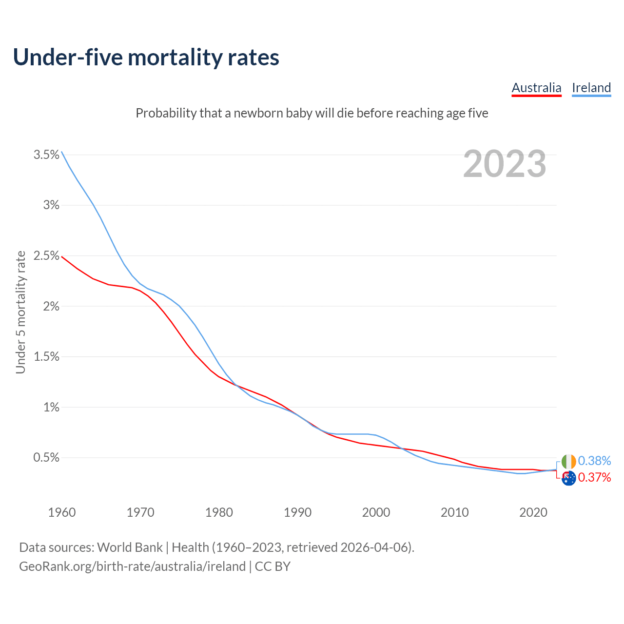 The chance that a newborn baby will die before reaching age five is 0.37% in Australia and 0.38% in Ireland. Above is a chart with historical data on under-five mortality rates.