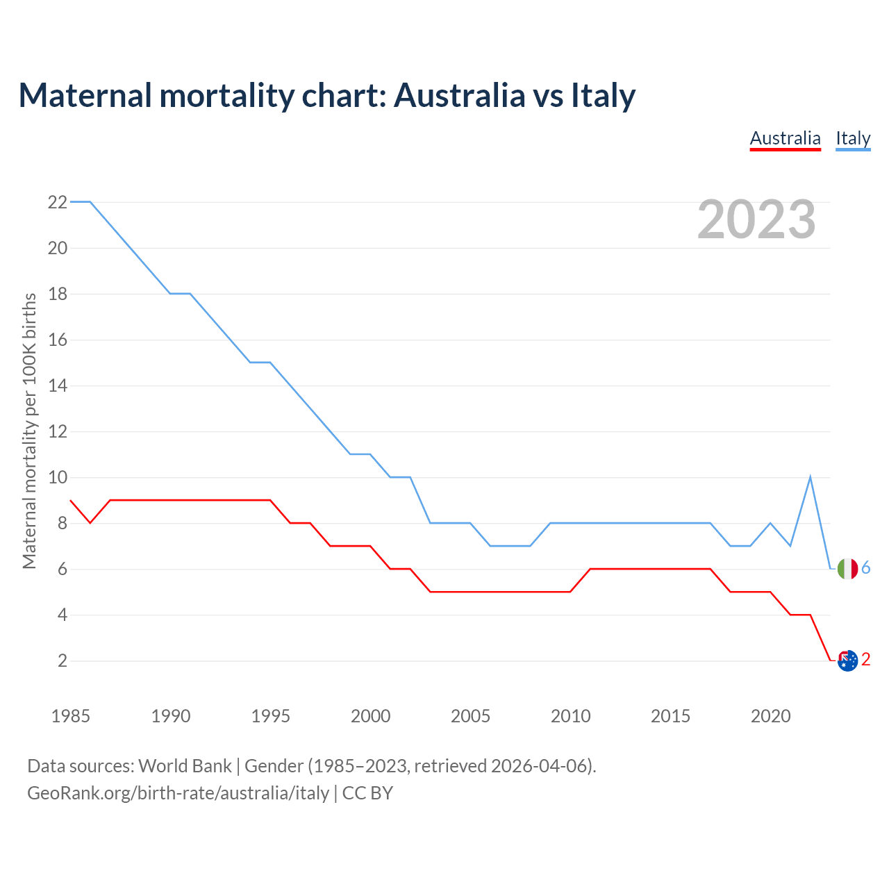 The maternal mortality rate, which is the probability of dying during childbirth or within 42 days of pregnancy termination, is 2 deaths per 100,000 live births in Australia, compared to 6 deaths in Italy.