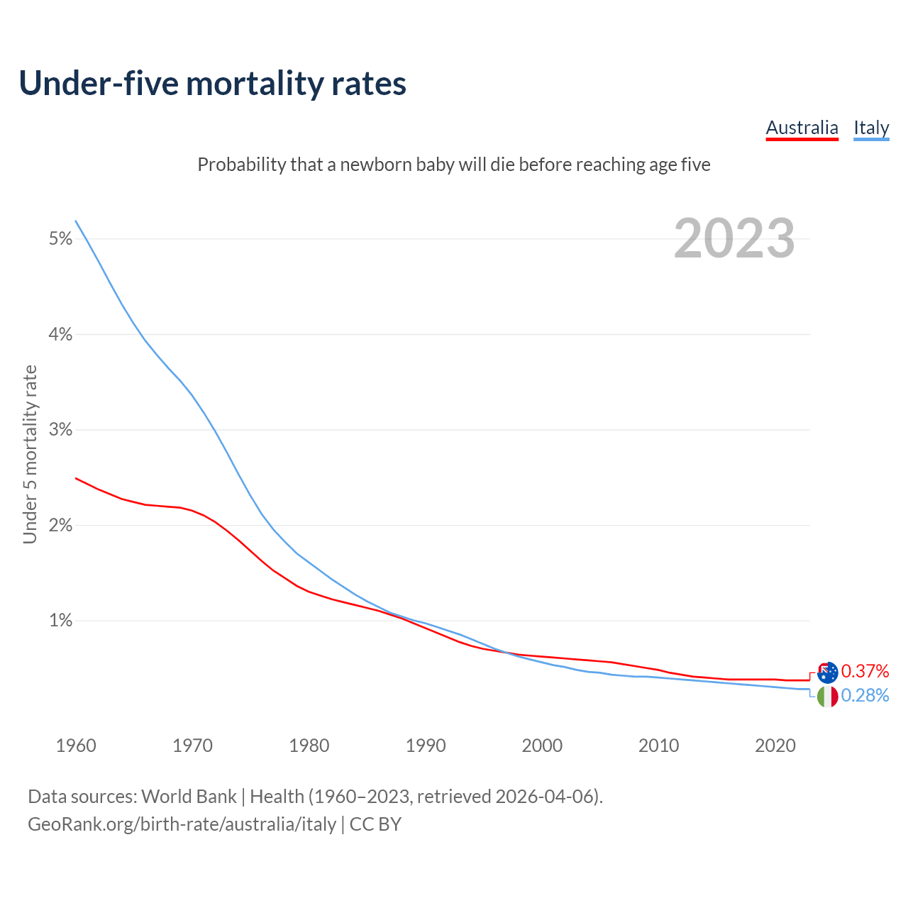 The chance that a newborn baby will die before reaching age five is 0.37% in Australia and 0.28% in Italy. Above is a chart with historical data on under-five mortality rates.