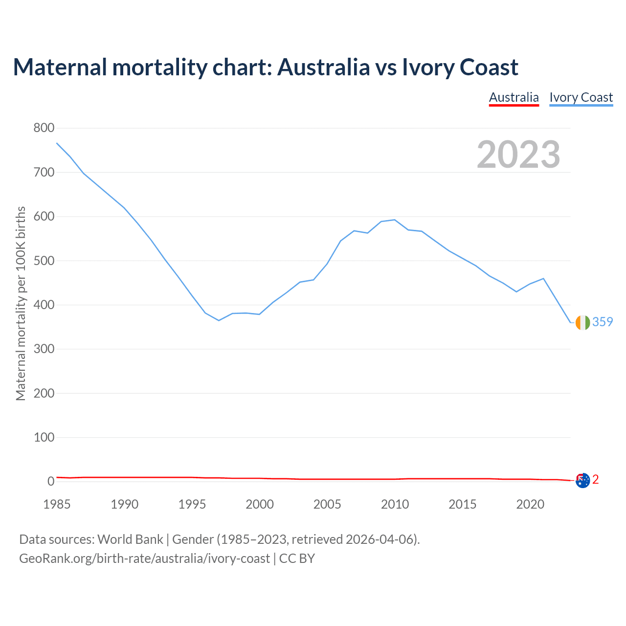 The maternal mortality rate, which is the probability of dying during childbirth or within 42 days of pregnancy termination, is 2 deaths per 100,000 live births in Australia, compared to 359 deaths in Ivory Coast.