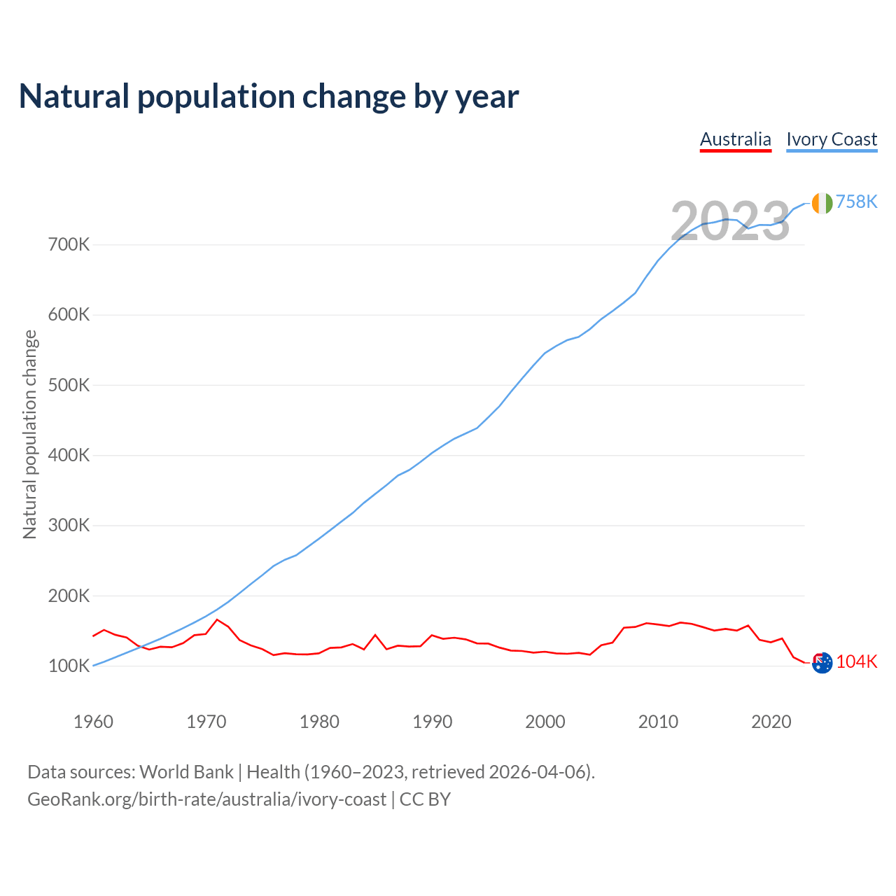 Australia has an annual birth rate of 10.8 births per 1,000 people, compared to 32 for Ivory Coast. The average number of children a woman is expected to have during her lifetime — the fertility rate, is 1.5 in Australia and 4.28 in Ivory Coast — 185.5% difference.