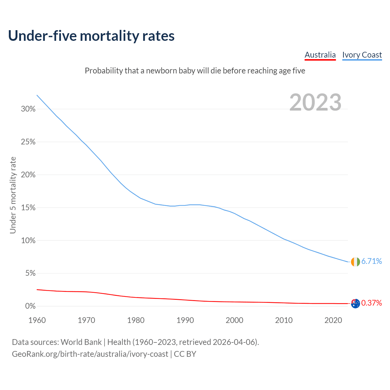 The chance that a newborn baby will die before reaching age five is 0.37% in Australia and 6.71% in Ivory Coast. Above is a chart with historical data on under-five mortality rates.