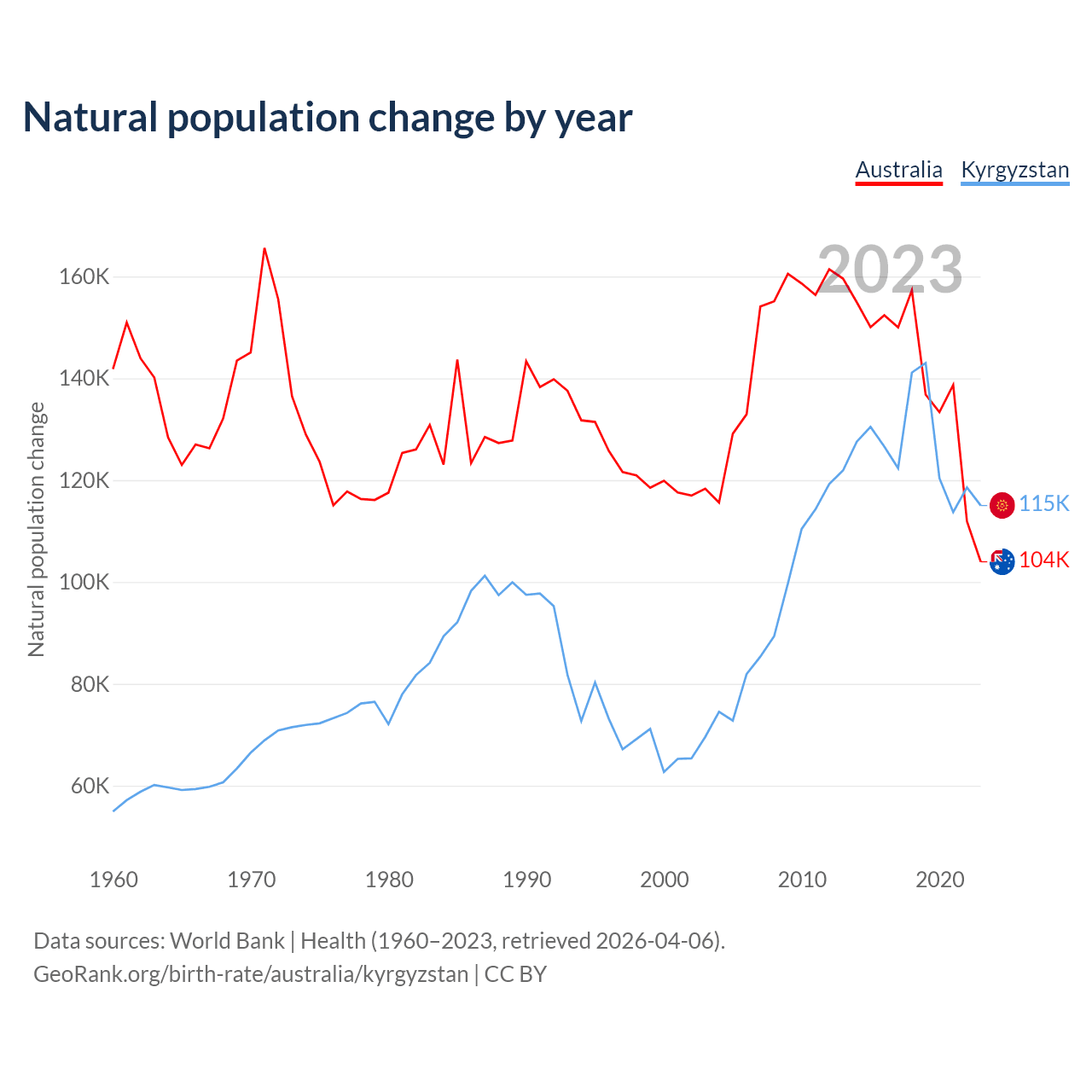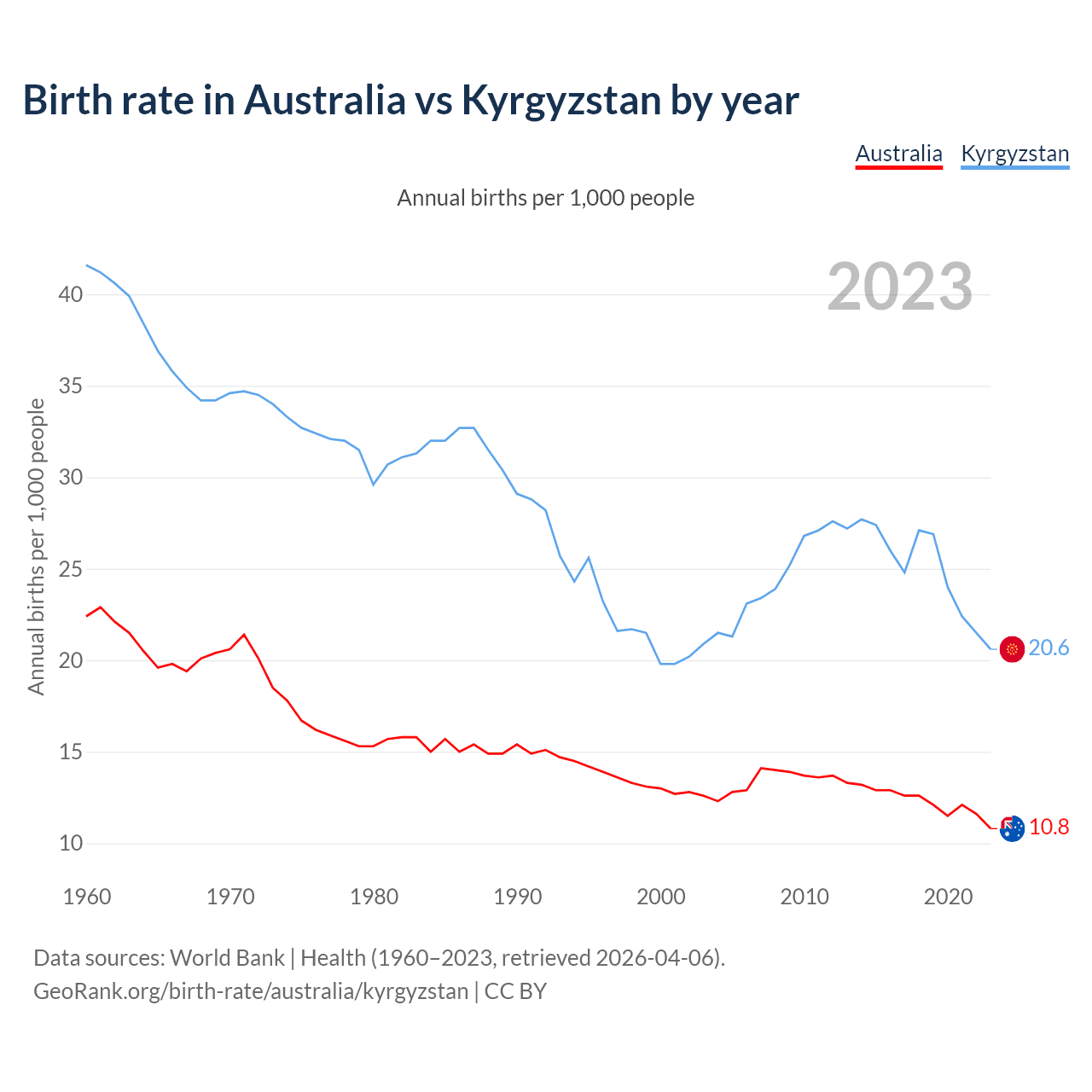 Australia has an annual birth rate of 10.8 births per 1,000 people, compared to 20.6 for Kyrgyzstan. The average number of children a woman is expected to have during her lifetime — the fertility rate, is 1.5 in Australia and 2.7 in Kyrgyzstan — 80% difference.