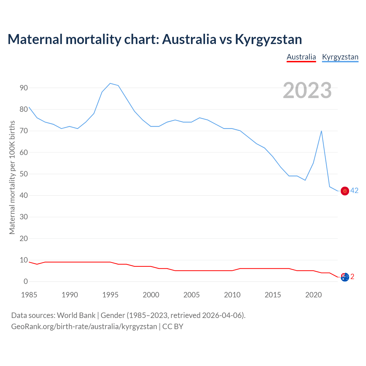The maternal mortality rate, which is the probability of dying during childbirth or within 42 days of pregnancy termination, is 2 deaths per 100,000 live births in Australia, compared to 42 deaths in Kyrgyzstan.