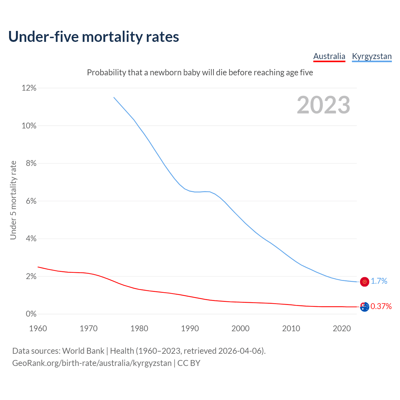 The chance that a newborn baby will die before reaching age five is 0.37% in Australia and 1.7% in Kyrgyzstan. Above is a chart with historical data on under-five mortality rates.