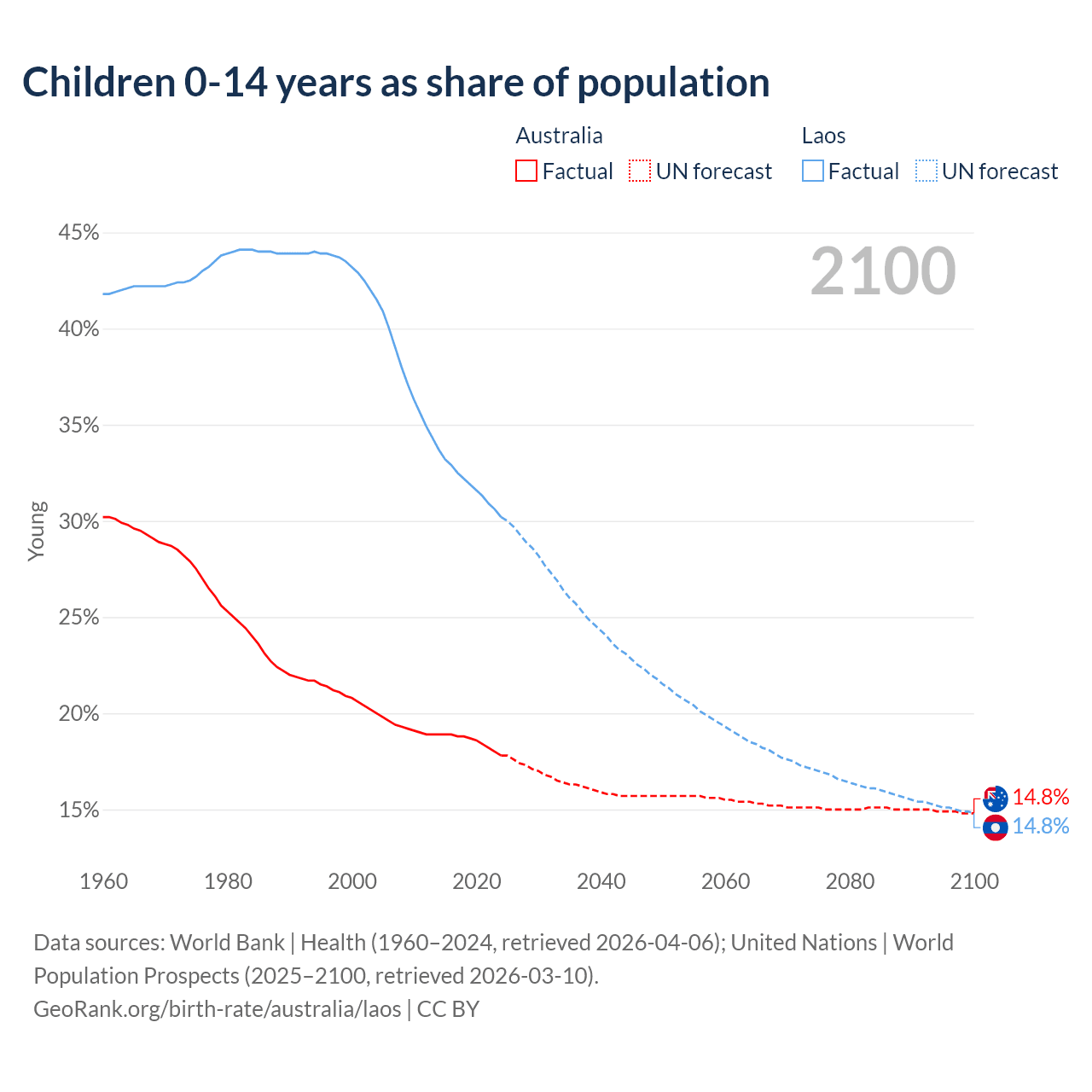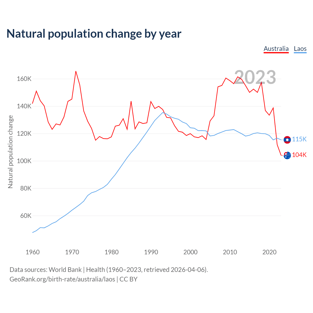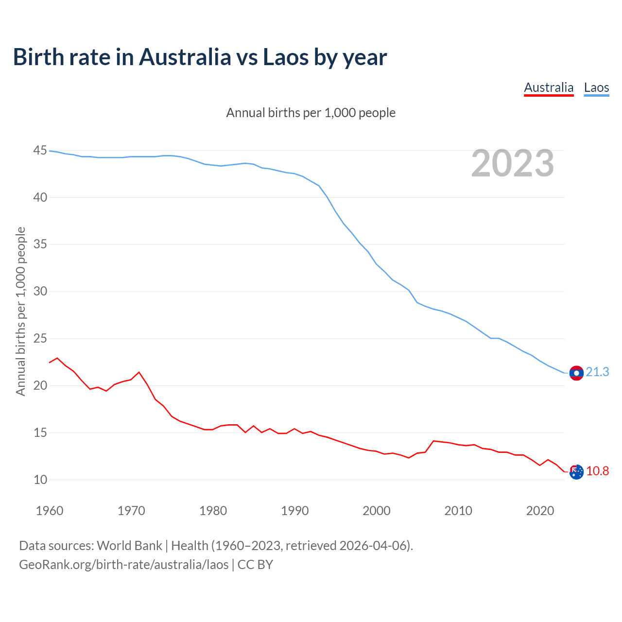 According to the latest available data on birth rates, the fertility rate in Australia was 1.5 children per woman in 2023, compared to 2.42 in Laos in 2023. The replacement level is considered to be 2.1 children per woman.