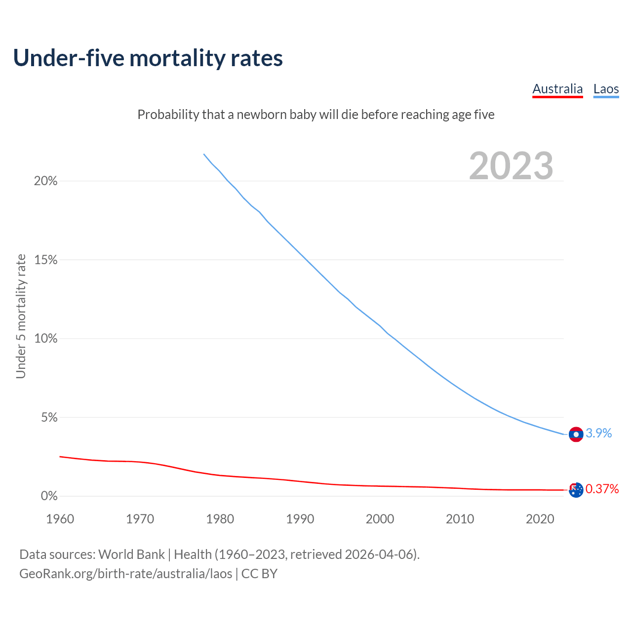 The chance that a newborn baby will die before reaching age five is 0.37% in Australia and 3.9% in Laos. Above is a chart with historical data on under-five mortality rates.