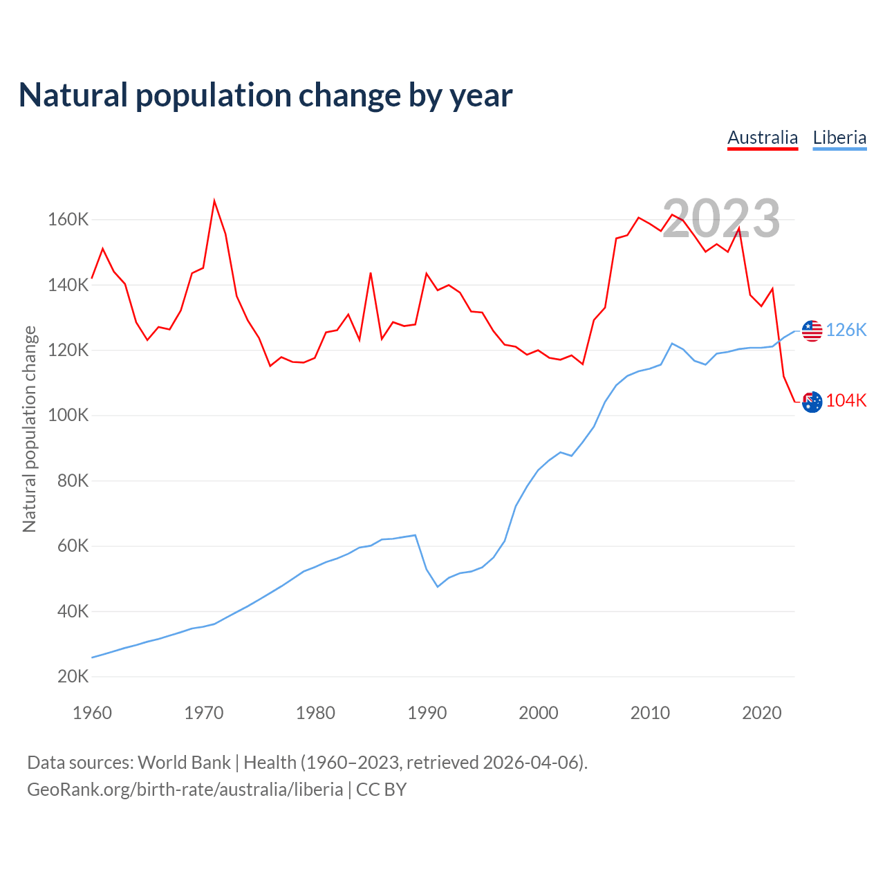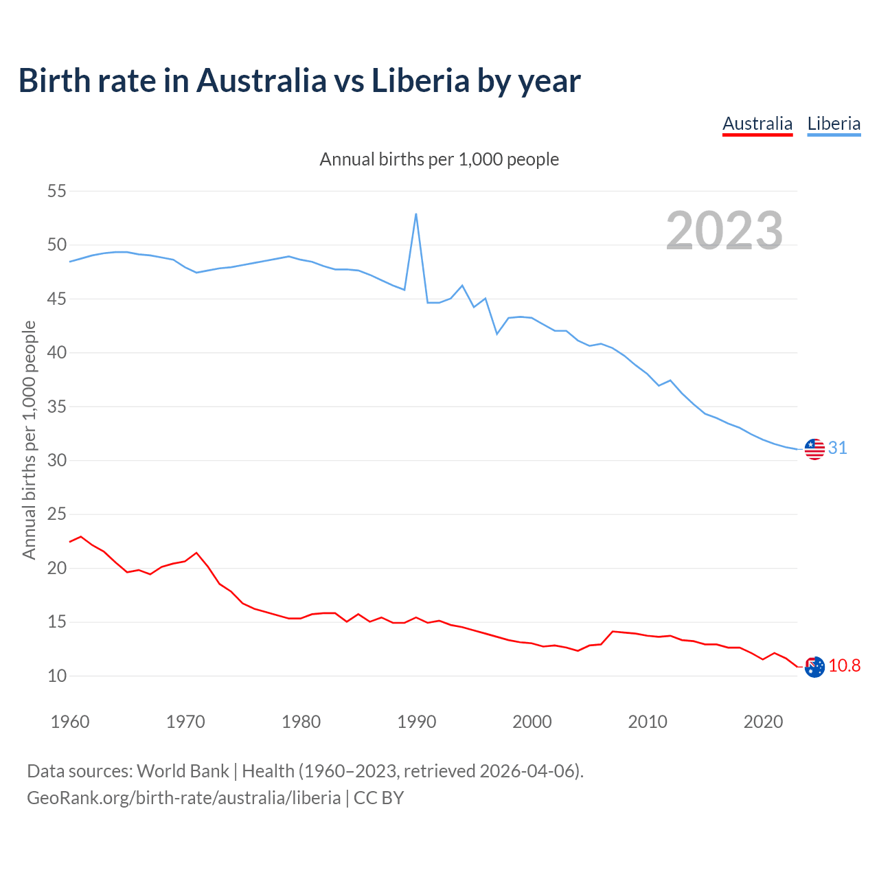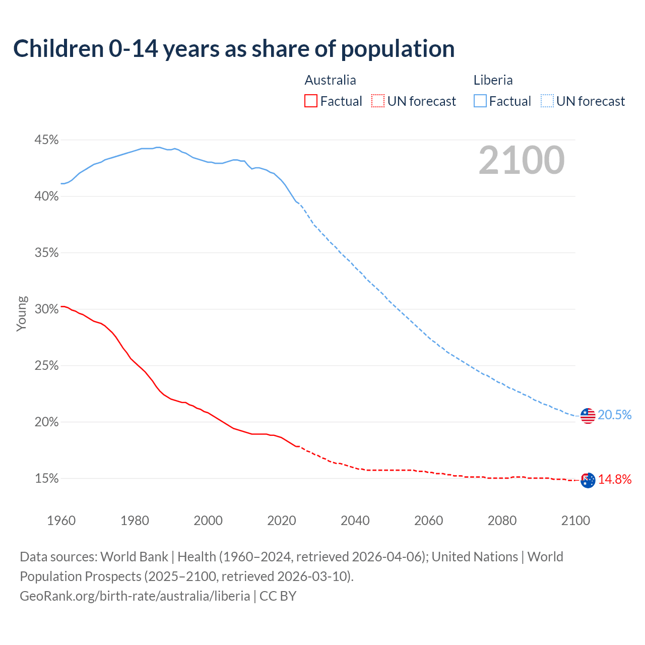 Australia has an annual birth rate of 10.8 births per 1,000 people, compared to 31 for Liberia. The average number of children a woman is expected to have during her lifetime — the fertility rate, is 1.5 in Australia and 3.95 in Liberia — 163.3% difference.