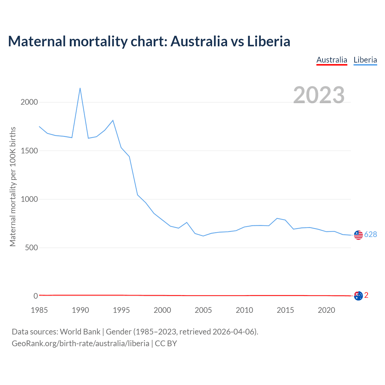 The maternal mortality rate, which is the probability of dying during childbirth or within 42 days of pregnancy termination, is 2 deaths per 100,000 live births in Australia, compared to 628 deaths in Liberia.