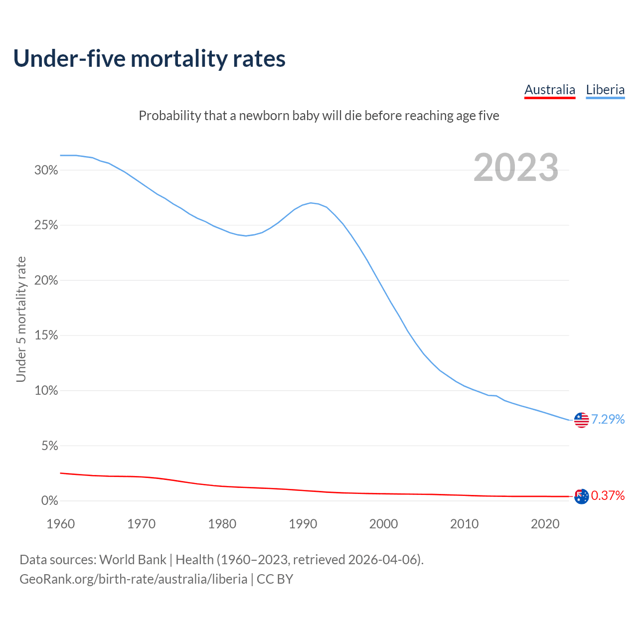 The chance that a newborn baby will die before reaching age five is 0.37% in Australia and 7.29% in Liberia. Above is a chart with historical data on under-five mortality rates.