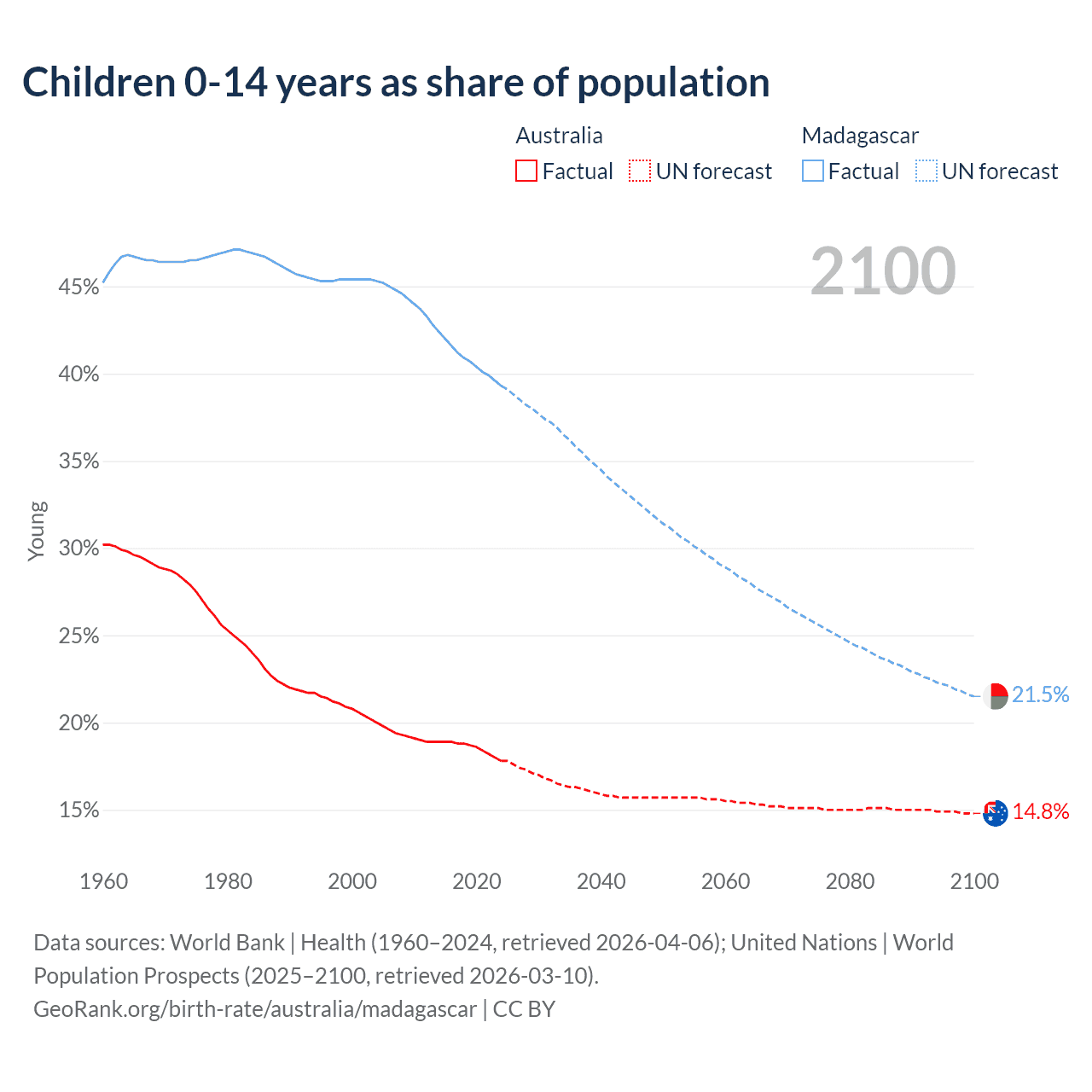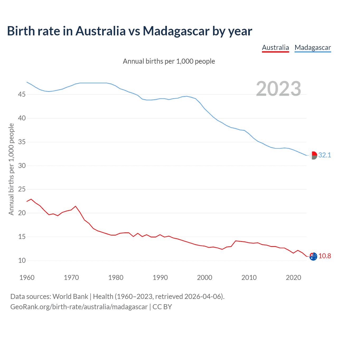 Australia has an annual birth rate of 10.8 births per 1,000 people, compared to 32.1 for Madagascar. The average number of children a woman is expected to have during her lifetime — the fertility rate, is 1.5 in Australia and 3.97 in Madagascar — 164.8% difference.