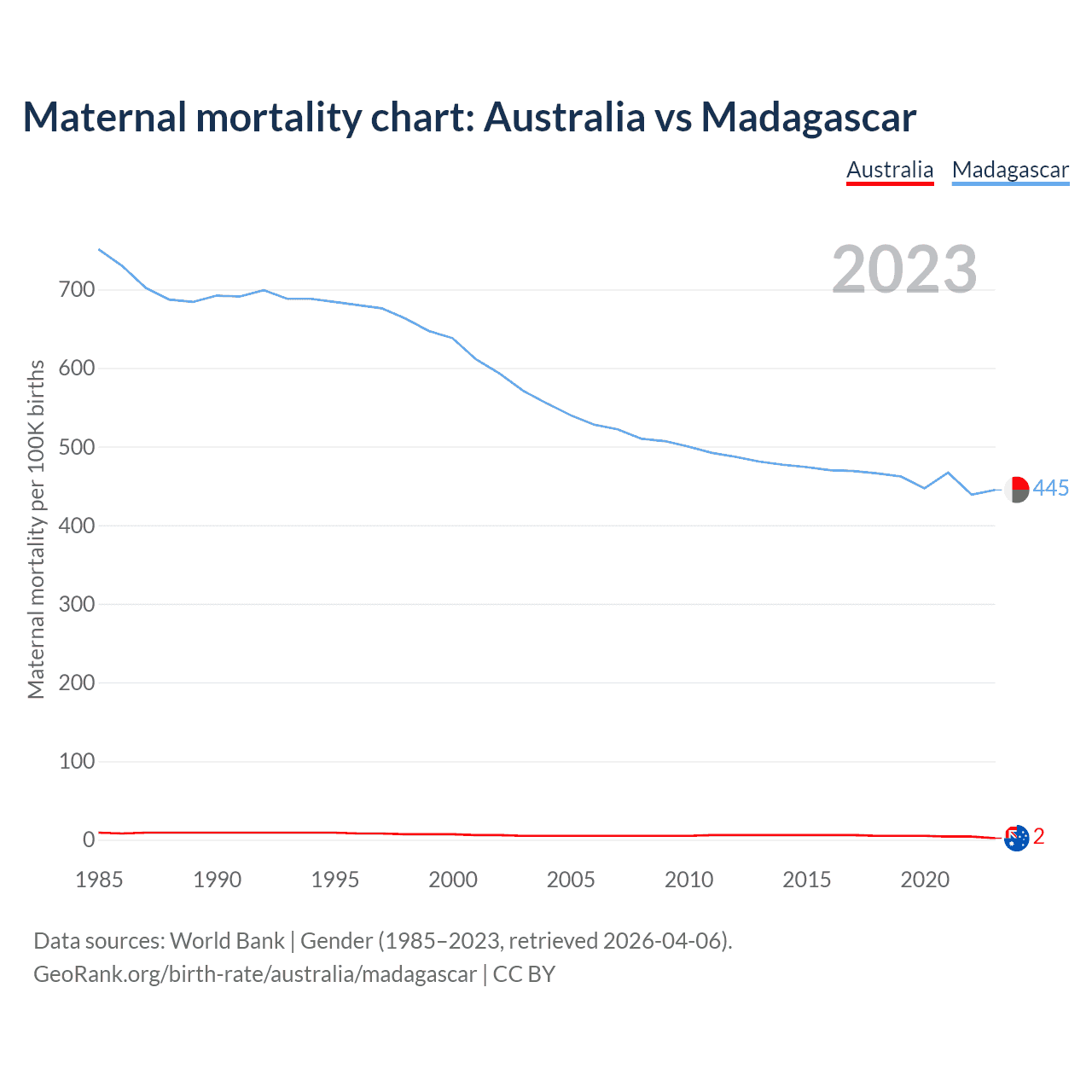 The maternal mortality rate, which is the probability of dying during childbirth or within 42 days of pregnancy termination, is 2 deaths per 100,000 live births in Australia, compared to 445 deaths in Madagascar.