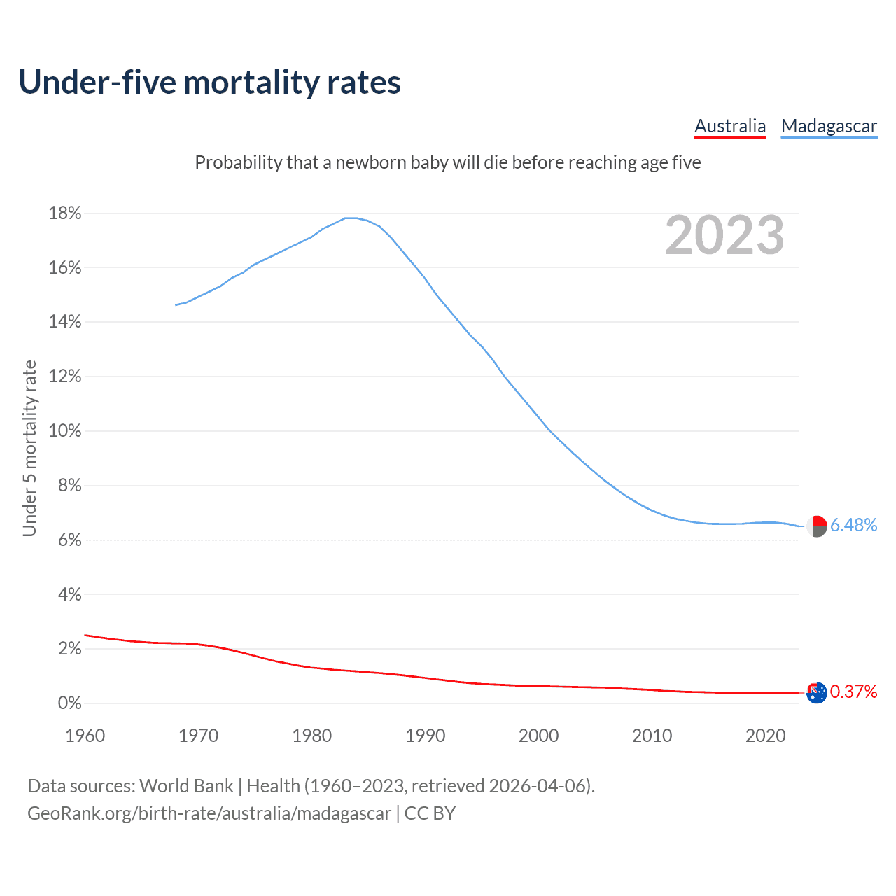 The chance that a newborn baby will die before reaching age five is 0.37% in Australia and 6.48% in Madagascar. Above is a chart with historical data on under-five mortality rates.