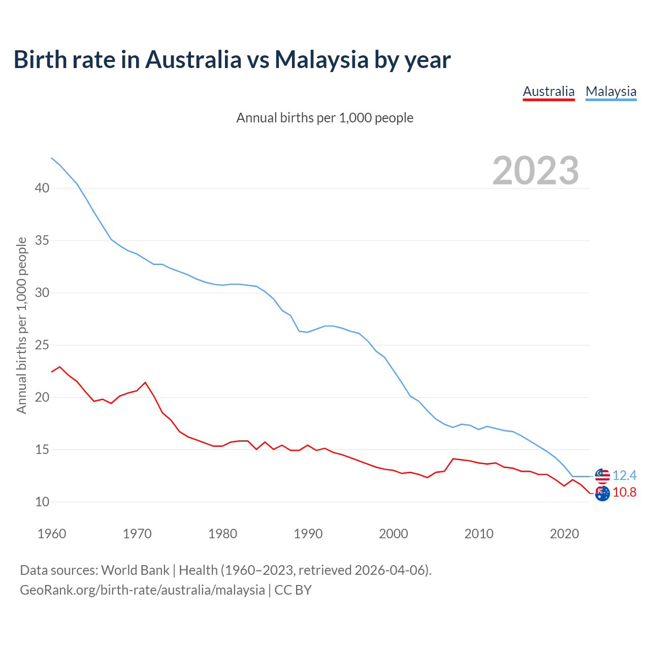 According to the latest available data on birth rates, the fertility rate in Australia was 1.5 children per woman in 2023, compared to 1.55 in Malaysia in 2023. The replacement level is considered to be 2.1 children per woman.