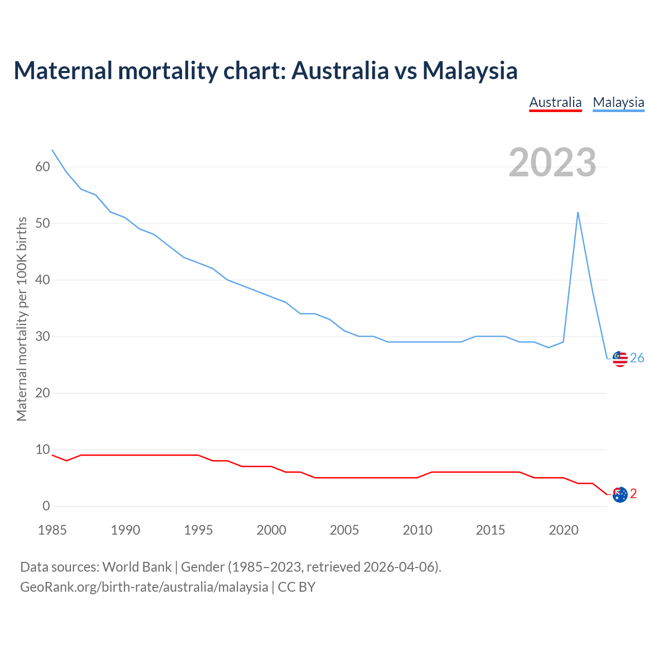 The maternal mortality rate, which is the probability of dying during childbirth or within 42 days of pregnancy termination, is 2 deaths per 100,000 live births in Australia, compared to 26 deaths in Malaysia.