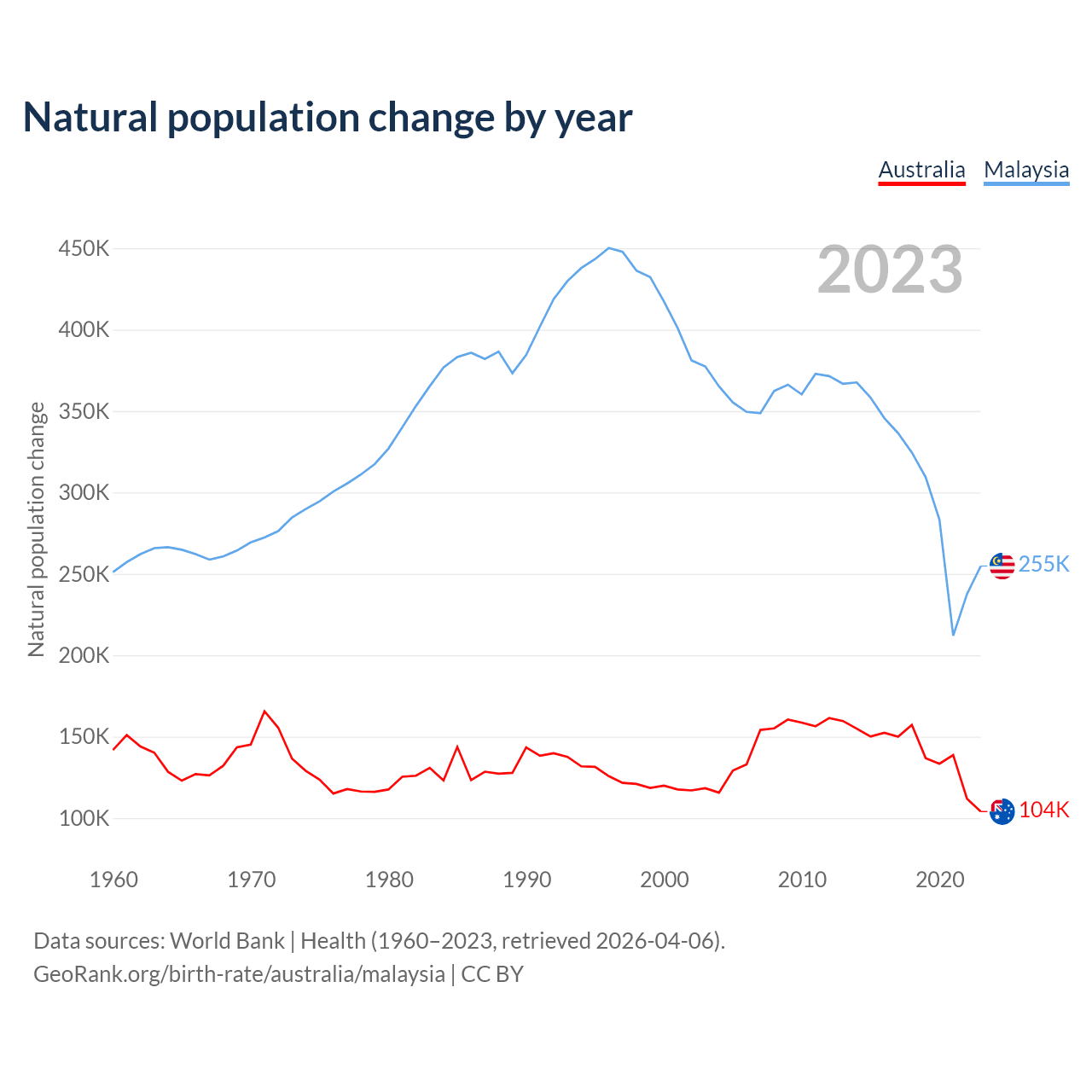 Australia has an annual birth rate of 10.8 births per 1,000 people, compared to 12.4 for Malaysia. The average number of children a woman is expected to have during her lifetime — the fertility rate, is 1.5 in Australia and 1.55 in Malaysia — 3.33% difference.