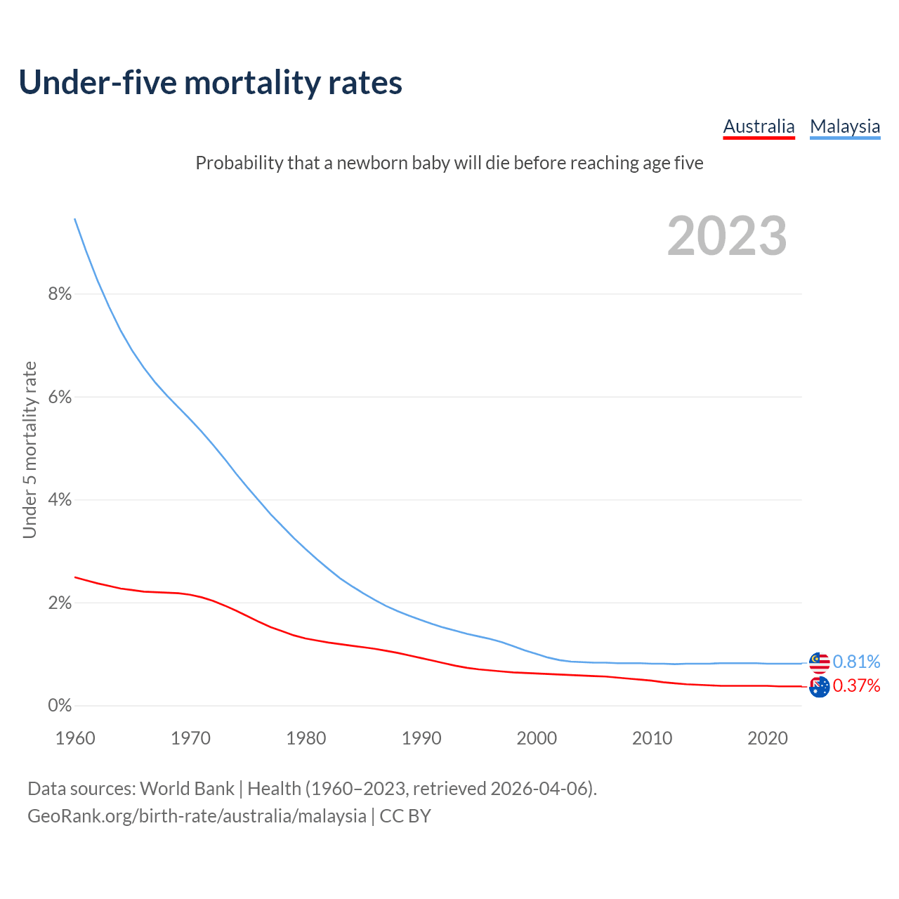 The chance that a newborn baby will die before reaching age five is 0.37% in Australia and 0.81% in Malaysia. Above is a chart with historical data on under-five mortality rates.