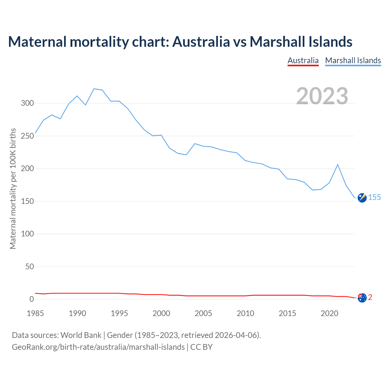 The maternal mortality rate, which is the probability of dying during childbirth or within 42 days of pregnancy termination, is 2 deaths per 100,000 live births in Australia, compared to 155 deaths in the Marshall Islands.