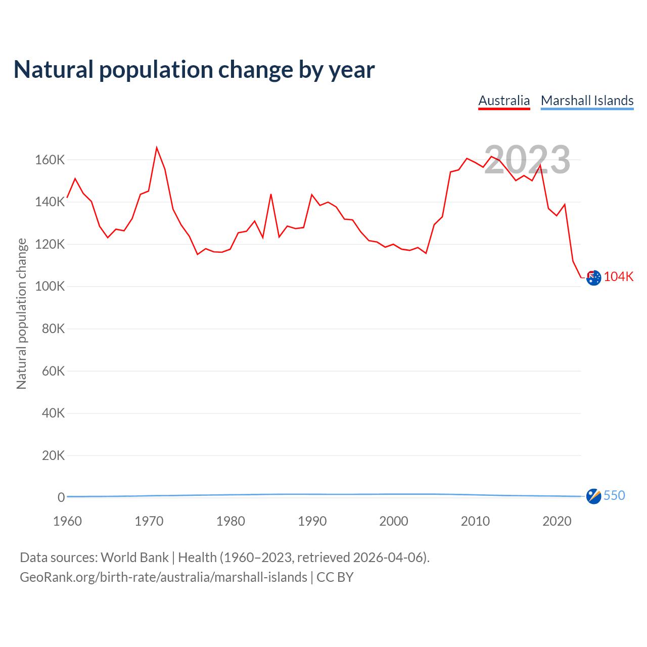 Australia has an annual birth rate of 10.8 births per 1,000 people, compared to 21.1 for the Marshall Islands. The average number of children a woman is expected to have during her lifetime — the fertility rate, is 1.5 in Australia and 2.92 in the Marshall Islands — 94.6% difference.
