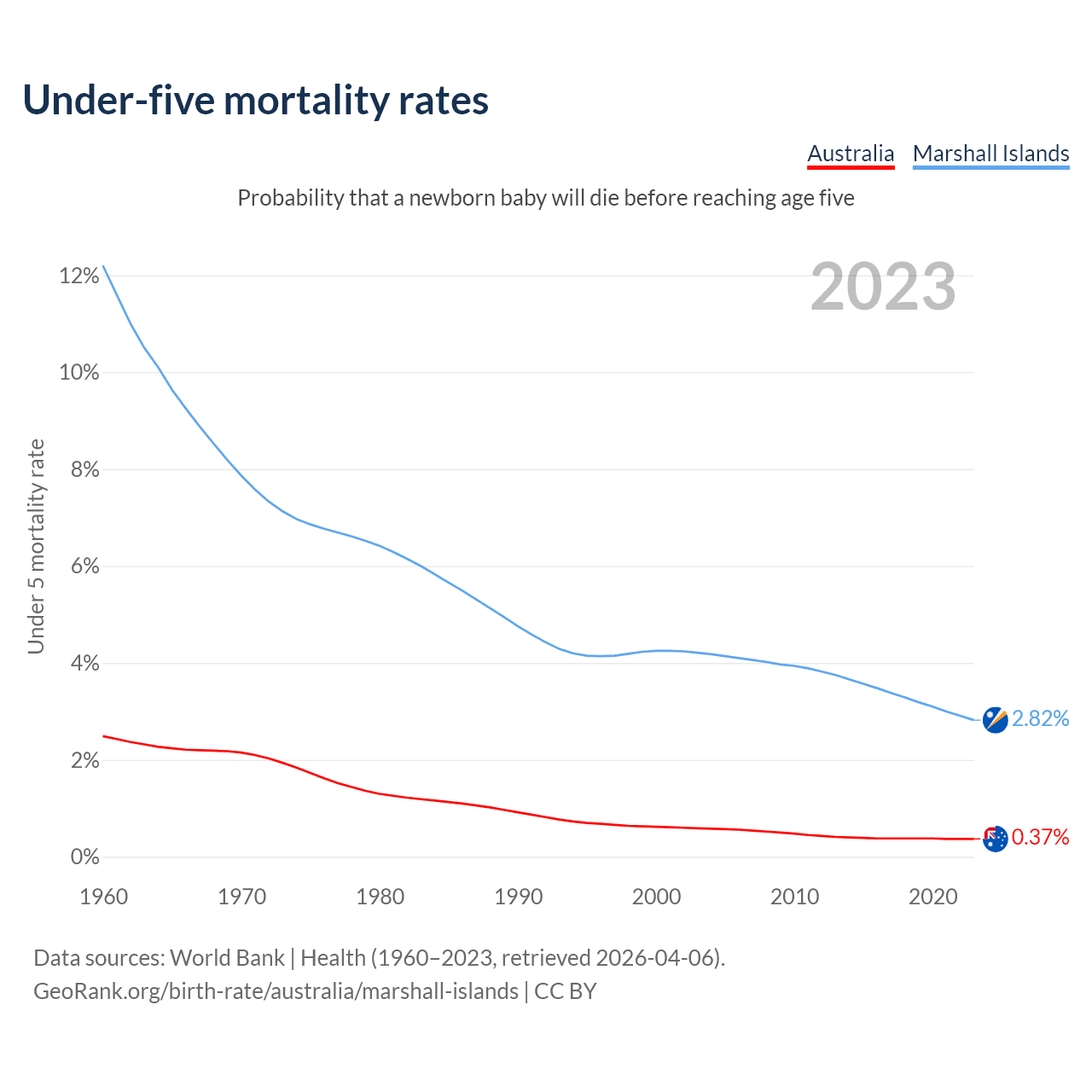 The chance that a newborn baby will die before reaching age five is 0.37% in Australia and 2.82% in the Marshall Islands. Above is a chart with historical data on under-five mortality rates.