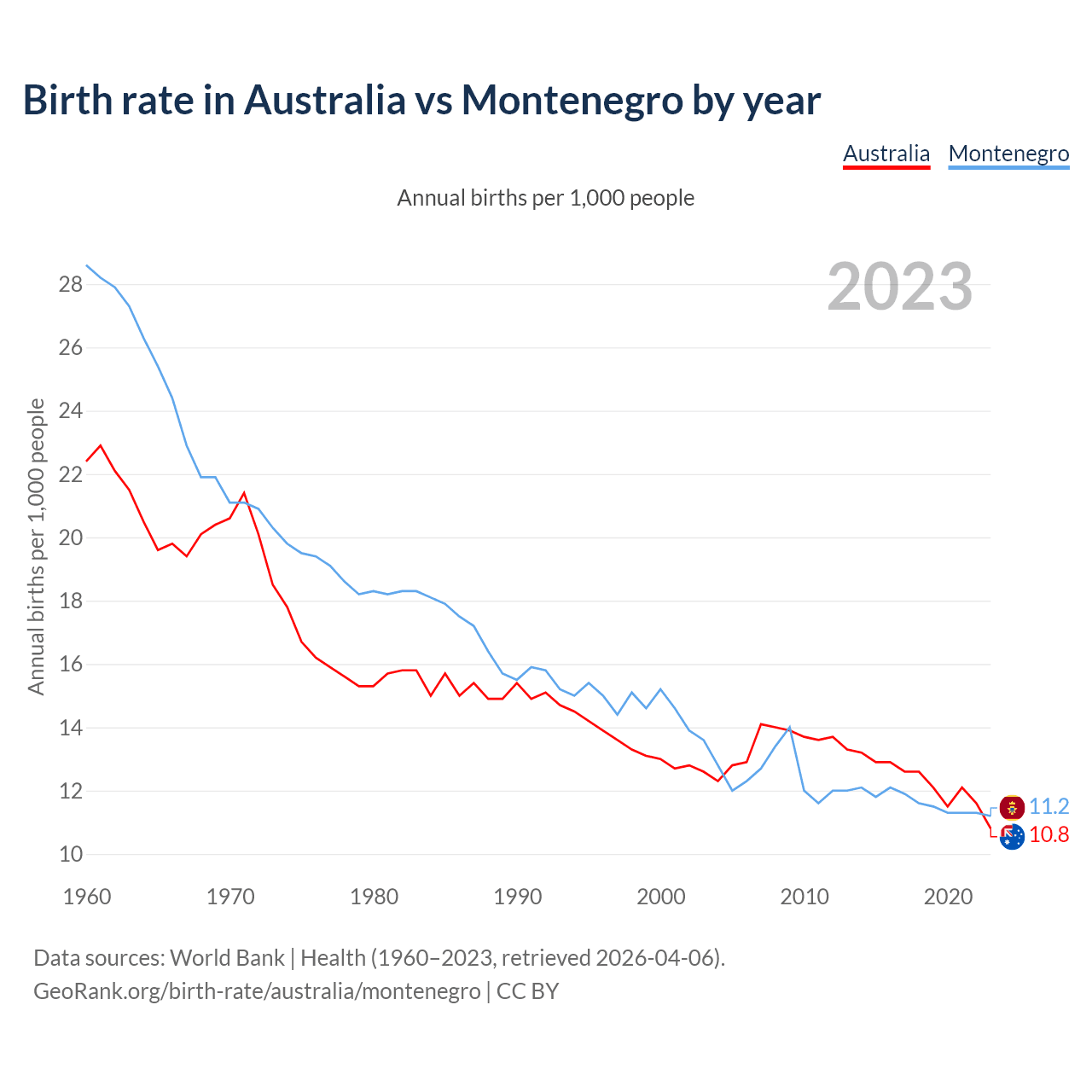 Australia has an annual birth rate of 10.8 births per 1,000 people, compared to 11.2 for Montenegro. The average number of children a woman is expected to have during her lifetime — the fertility rate, is 1.5 in Australia and 1.74 in Montenegro — 16% difference.
