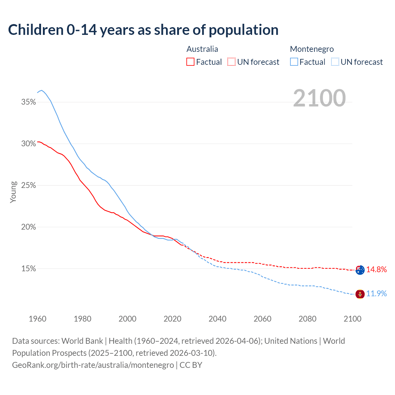 According to the latest available data on birth rates, the fertility rate in Australia was 1.5 children per woman in 2023, compared to 1.74 in Montenegro in 2023. The replacement level is considered to be 2.1 children per woman.